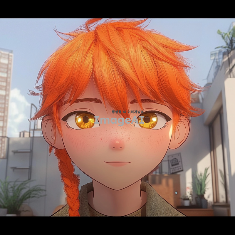 주황색 머리와 황금색 눈을 가진 귀여운 애니메이션 소년, 머리 한쪽에 긴 땋은 머리를 하고 있으며, 배경은 아파트입니다. 아름다움을 믿을 수 없을 정도로, 세밀한 얼굴 특징을 가진, K-24 애니메이션 스타일입니다.