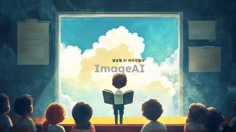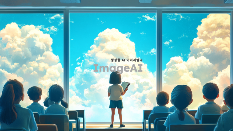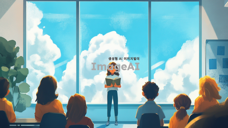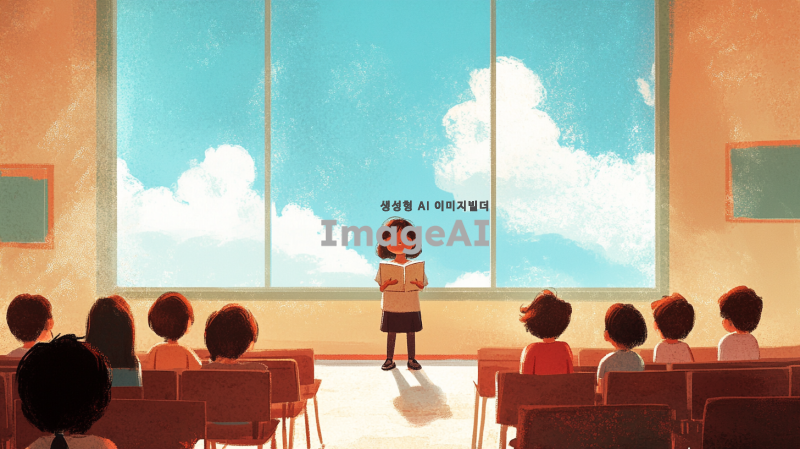 초등학교 교실에서 가운데 서서 발표하는 아이. 친구들이 호기심 어린 눈으로 아이를 쳐다보고 있다. 아이는 부끄러운듯 책으로 얼굴을 숨긴다. 창 밖으로는 맑은 하늘과 청량한 구름이 떠다니고 있다.