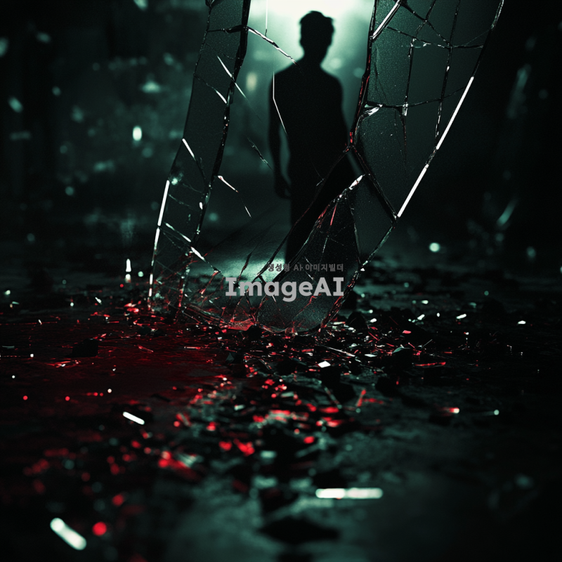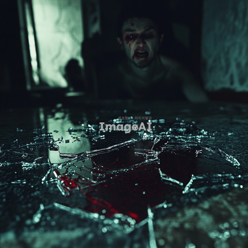 어두운 방 안, 바닥에 흩어진 깨진 유리조각들, 유리조각에 반사된 남자의 겁에 질린 표정, 유리조각에 묻은 검붉은 액체, 어둡고 공포스러운 분위기, 섬뜩한 조명과 그림자 효과