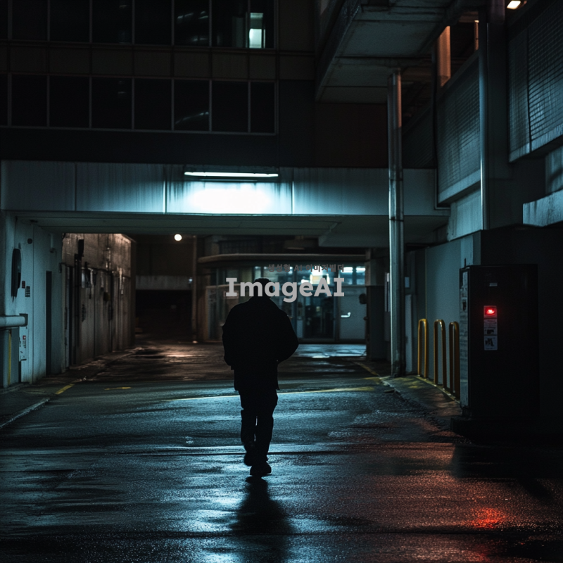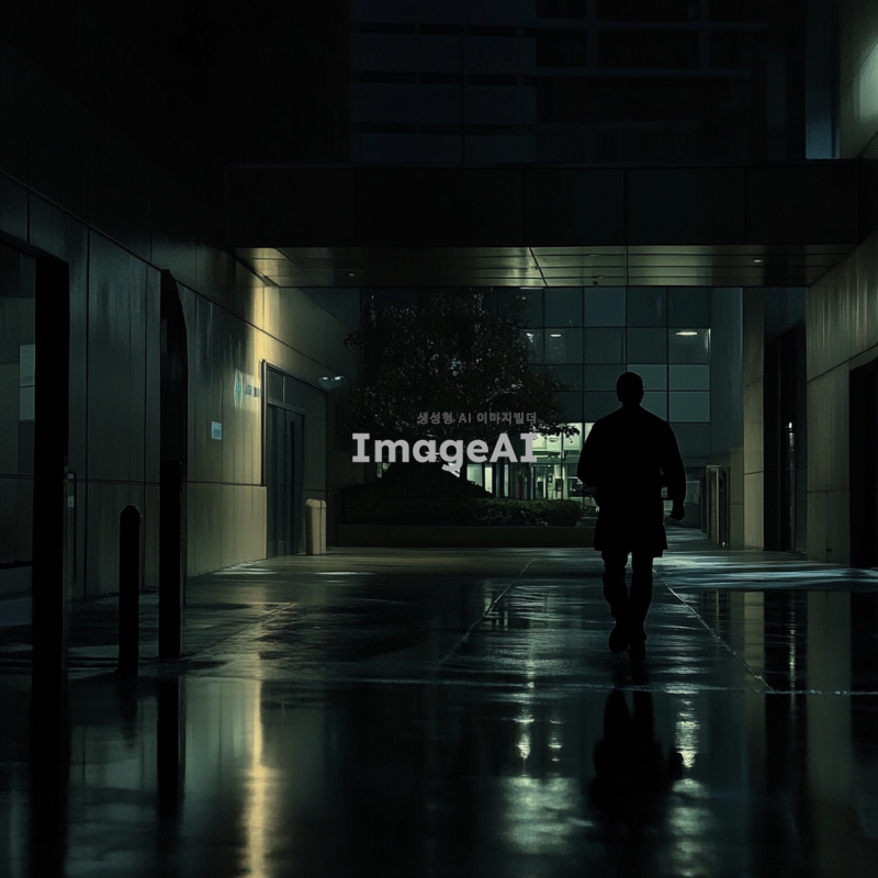 어두운 밤, 남자가 향하는 방향에는 큰 경찰서가 보인다. 남자의 옷은 어두운 색깔로, 검은 옷을 입고있다. 그의 발걸음은 결단력 있어 보이며, 서두르는것처럼 보인다