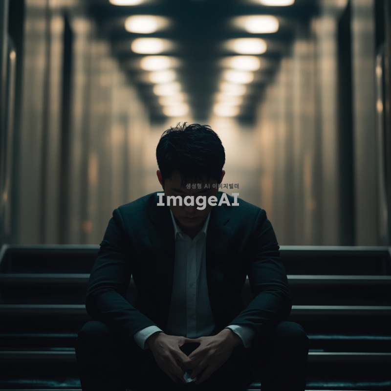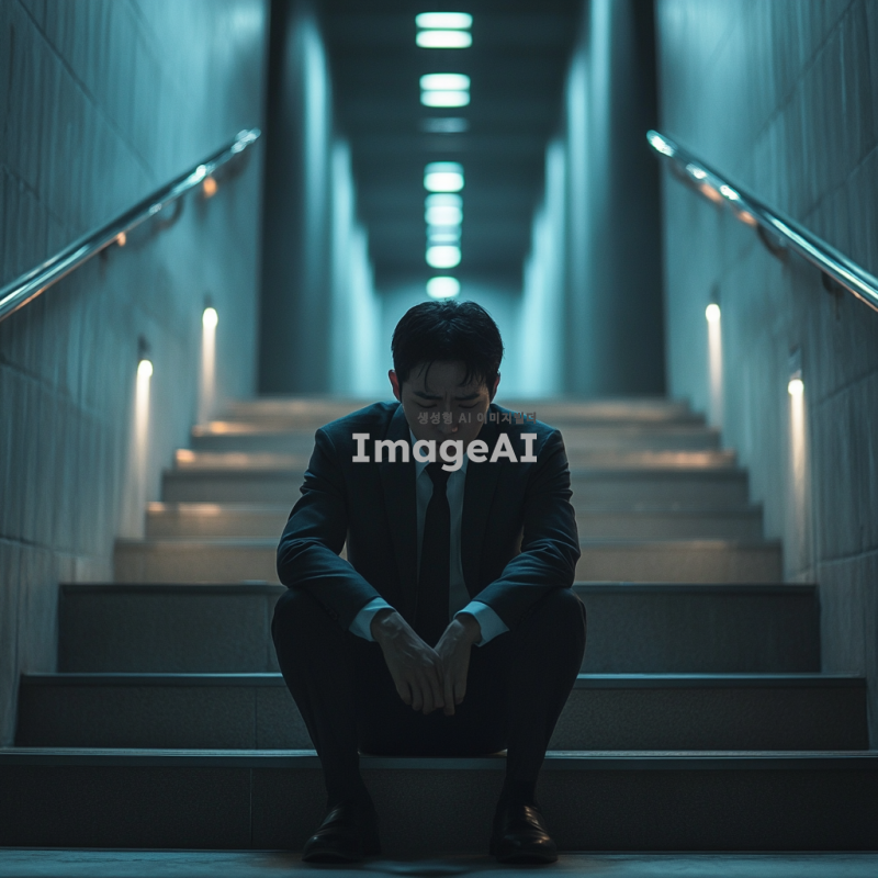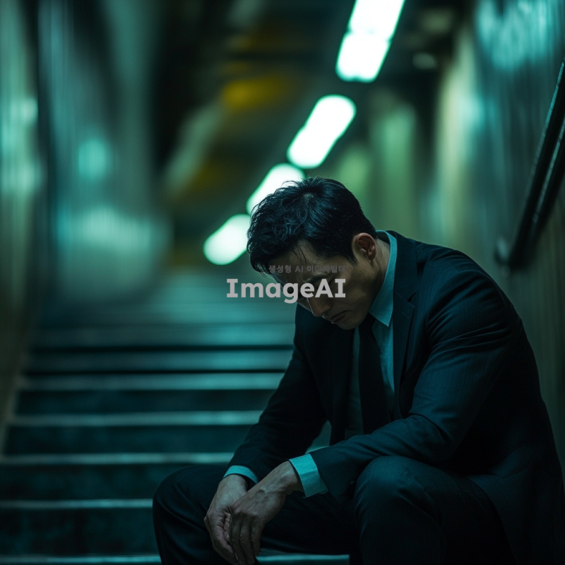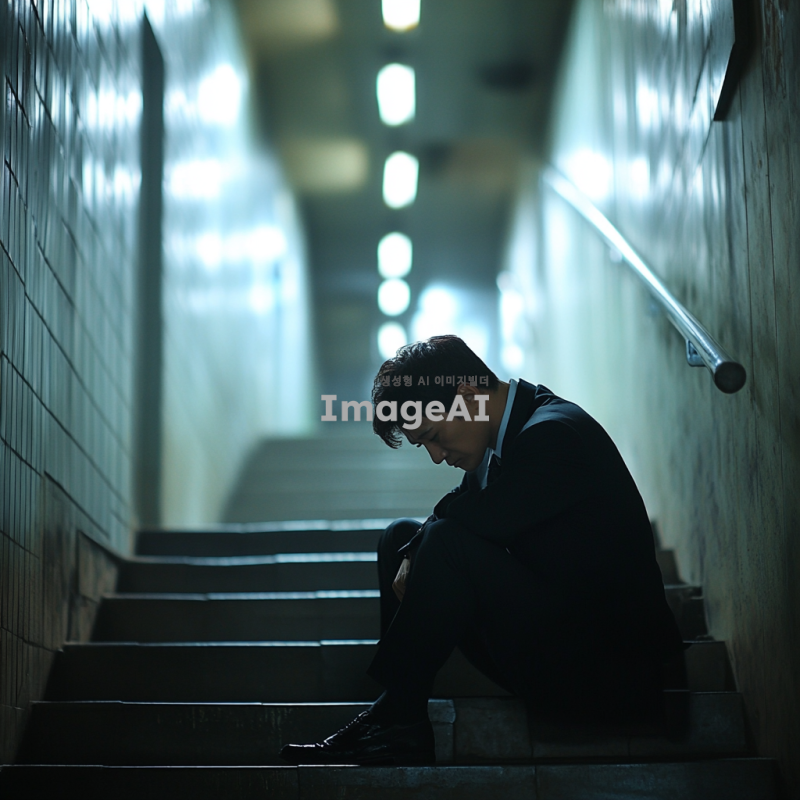 양복을 입은 한국인 남자가 계단에 앉아 고개를 숙이고 망연자실해 하는 모습, 뒤로는 긴 복도가 이어져 있으며 어둡고 무거운 분위기, 복도의 조명은 희미하게 켜져 있어 전체적으로 음울한 느낌을 주는 장면.