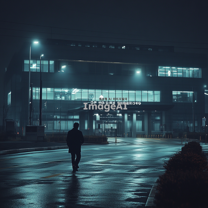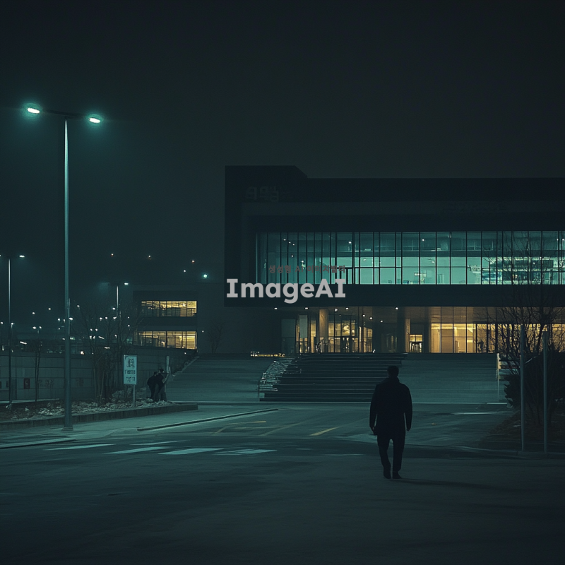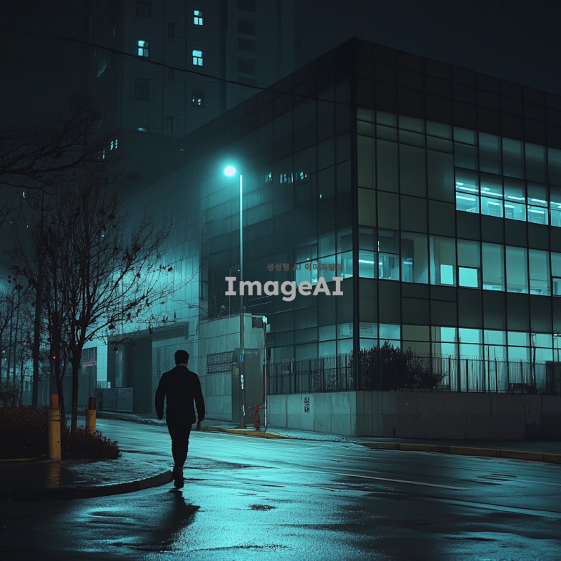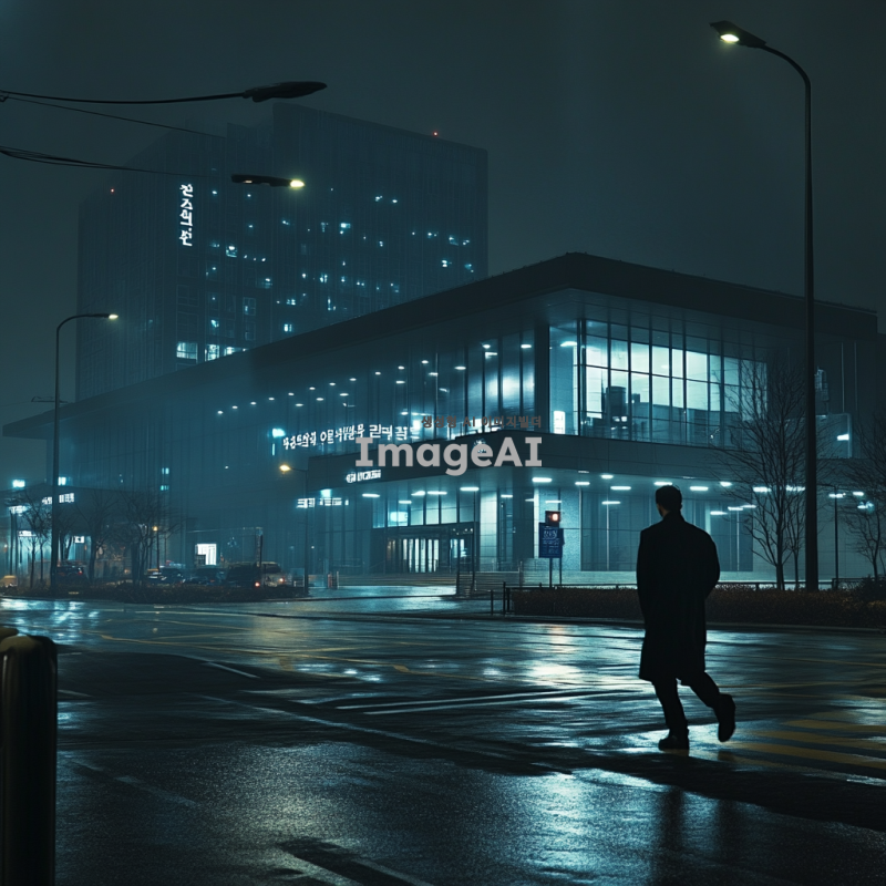 어두운 밤, 검은 옷을 입은 남자가 급히 걸어가는 뒷모습,현대 한국의 큰 경찰서가 정면에 보이는 장면, 주변은 고요하고 어두운 분위기, 도로와 가로등이 희미하게 비추는 장면, 긴장감 있는 분위기.