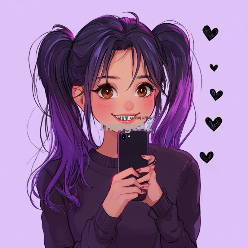 보라색과 검은색이 섞인 양걀래머리를 한 소녀야. 소녀의 눈은 갈색이고 입은 미소를 짓고 있어. 배경은 연보라색에 검은 하트가 그려져 있고, 소녀는 손에 아이폰을 들고 있어