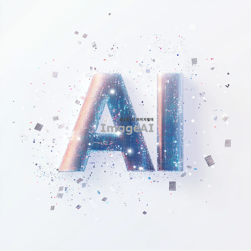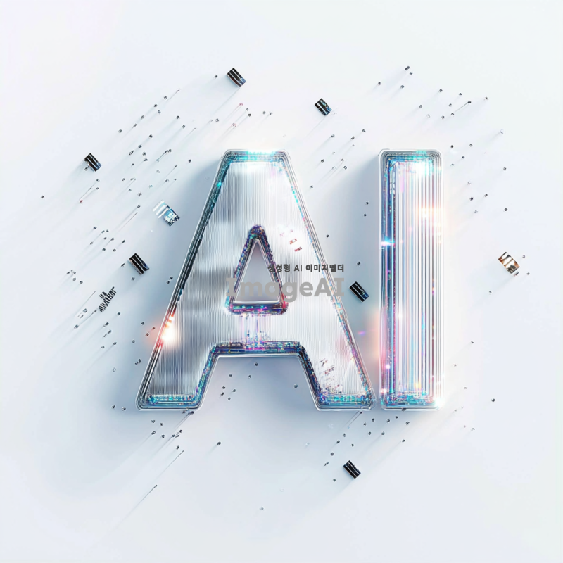 배경은 밝고 깨끗한 느낌의 하얀색, 중앙에 AI라는 단어가 크게 적힌 이미지. 글씨체는 미래적인 느낌의 세련되고 모던한 서체, 글씨 색상은 메탈릭 실버로 빛나는 효과. 주변에는 작은 데이터 코드 조각들이 흩어져 있는 모습, 전체적으로 기술적이고 현대적인 분위기.