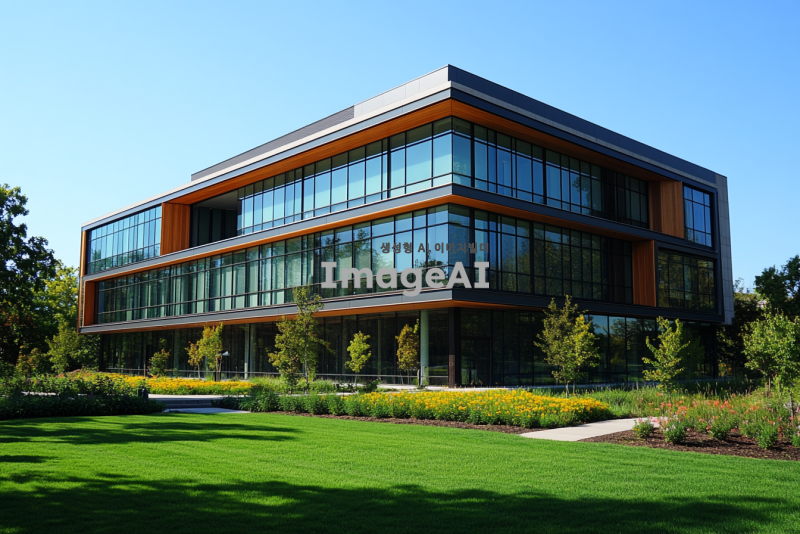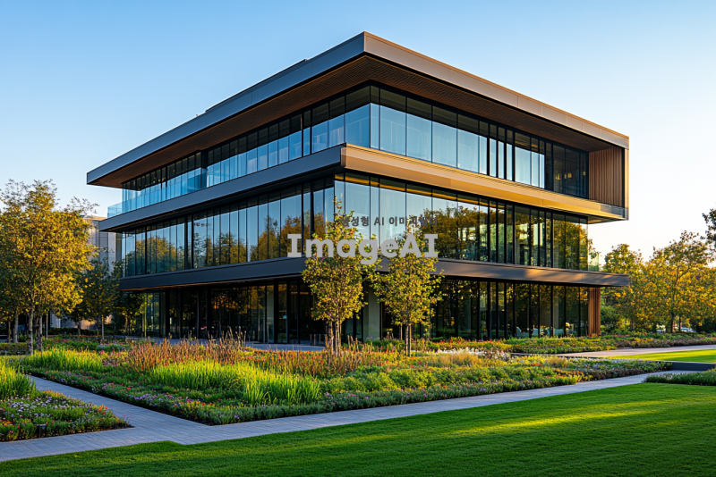 4층짜리 현대적인 건물이 잔디 정원에 둘러싸여 있는 모습. 건물은 유리와 금속 소재로 이루어져 있으며, 넓은 창문이 특징적이다. 정원은 깔끔하게 정돈되어 있고, 곳곳에 작은 나무와 꽃들이 심어져 있다. 건물의 외관은 세련되고 현대적인 디자인을 강조하며, 주변 환경과 조화를 이루고 있다. 하늘은 맑고 푸른색이며, 햇빛이 건물과 정원에 부드럽게 비추고 있다.