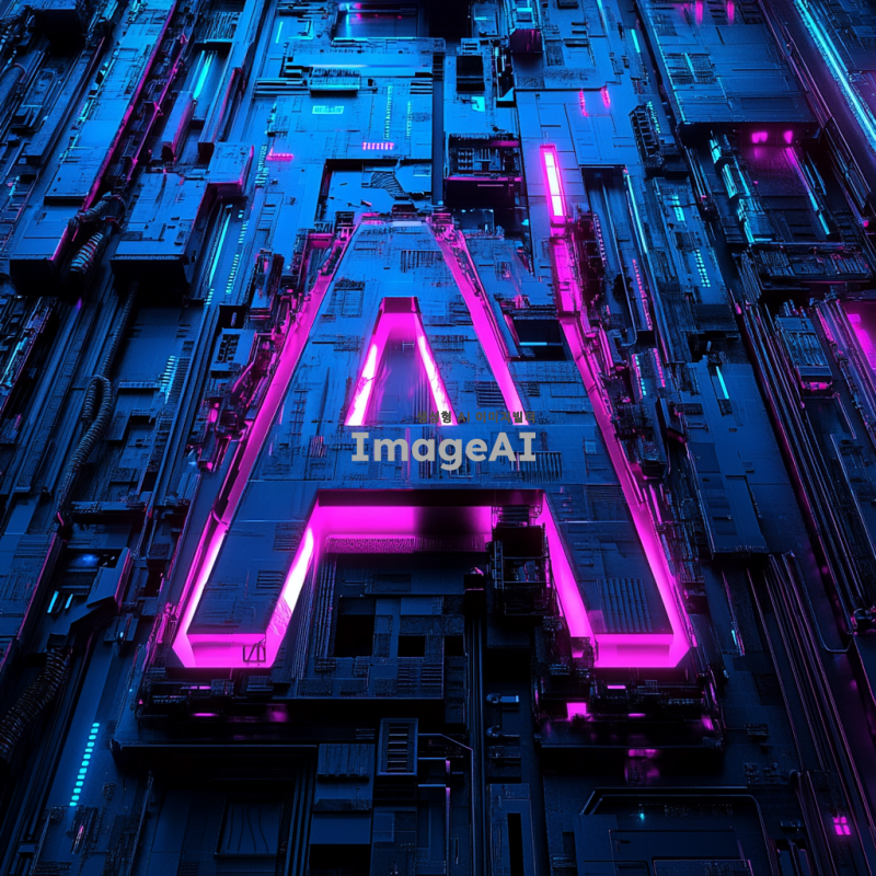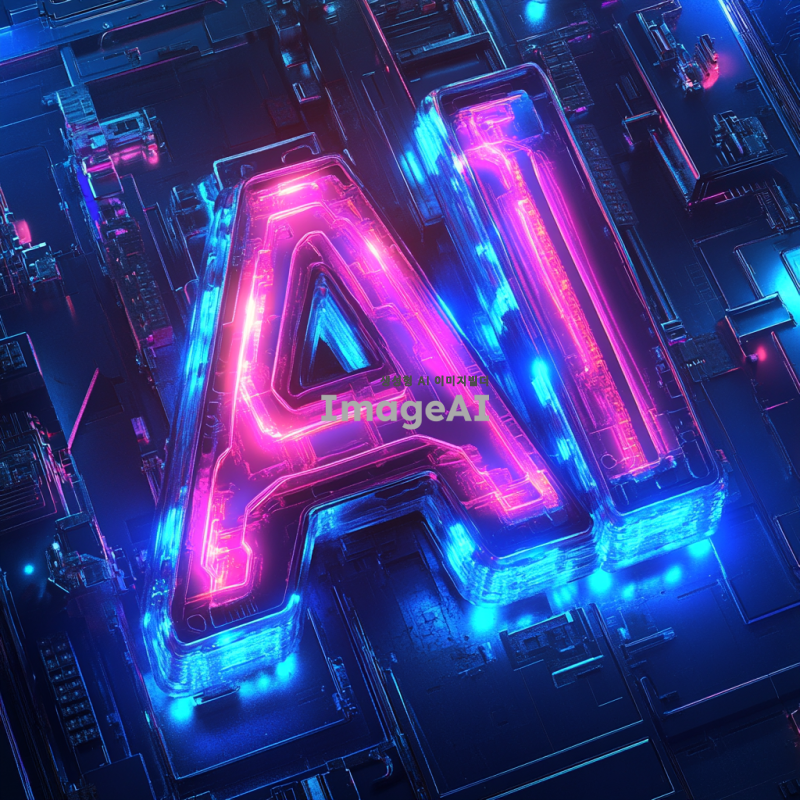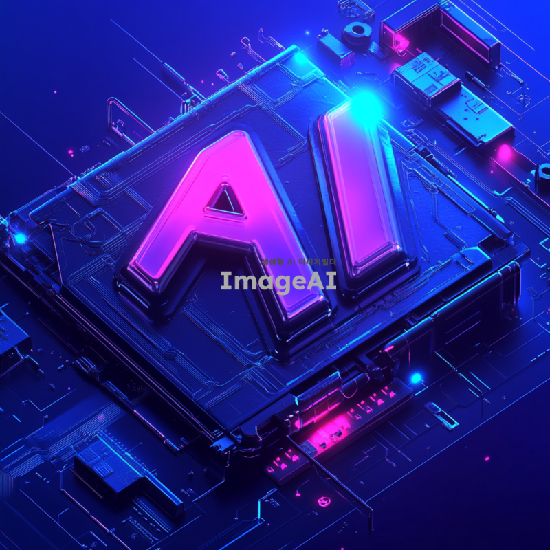 파란 배경 위에 'AI'라는 글자가 중앙에 크게 자리 잡고 있는 이미지, 글자는 미래적인 폰트로 디자인되어 있으며, 빛나는 효과가 추가되어 있어 첨단 기술의 느낌을 강조, 글씨 주위에는 은은한 파란색과 보라색의 빛이 퍼져나가며 신비로운 분위기를 연출, 글자 주변에 작은 기계 부품이나 전자 회로 패턴이 배치되어 있어 기술적인 요소를 더함.