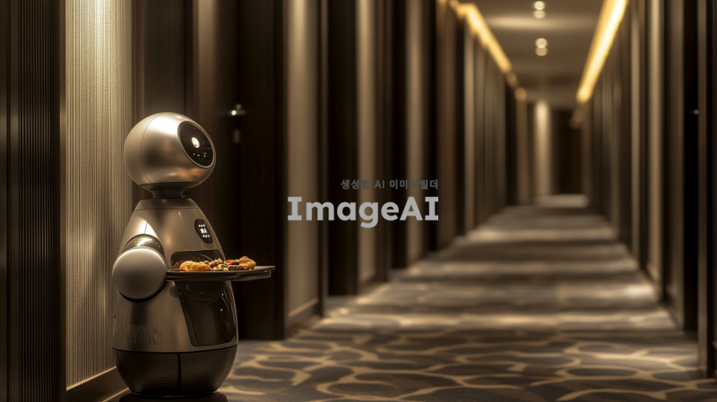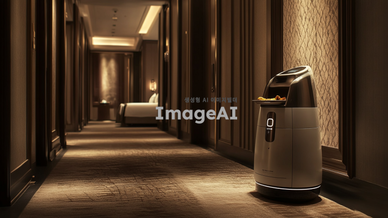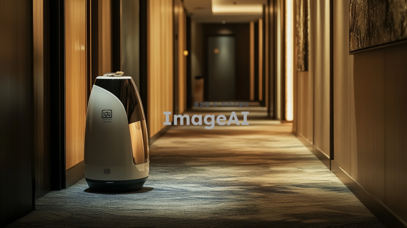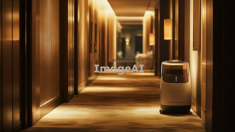 • 설명: 호텔 복도에서 작고 세련된 AI 로봇이 방 앞에 서서 손님에게 물건(예: 음식 트레이)을 전달하는 장면.
