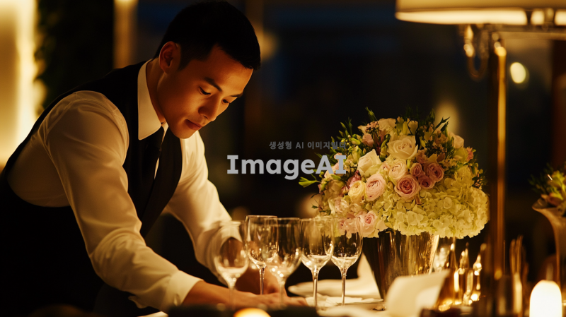 • 설명: 호텔리어가 결혼기념일 테이블을 정성스럽게 세팅하는 모습. 테이블에는 꽃, 와인잔, 촛불 등이 놓여 있음.