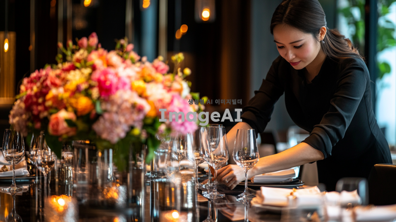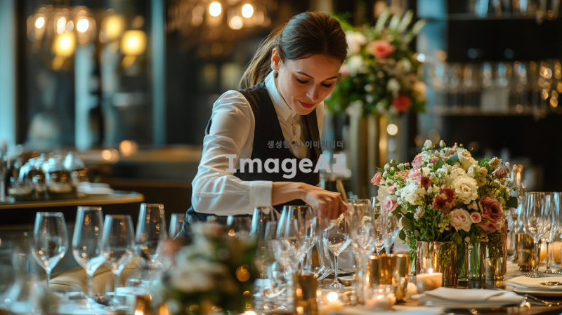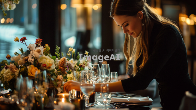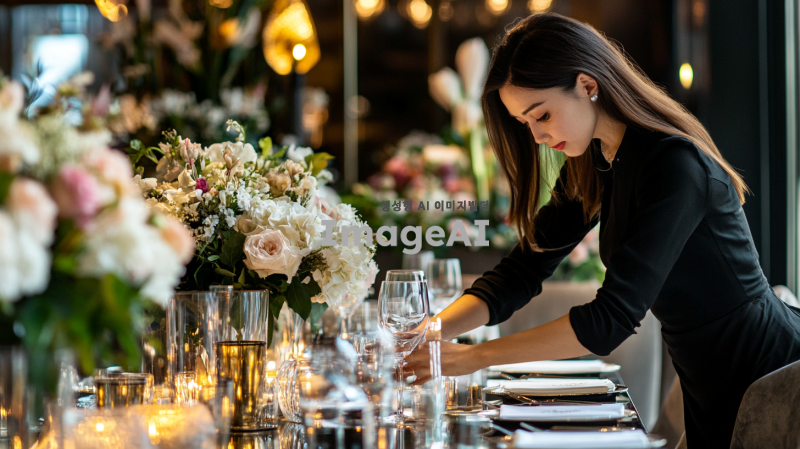 • 설명: 여자 호텔리어가 결혼기념일 테이블을 정성스럽게 세팅하는 모습. 테이블에는 꽃, 와인잔, 촛불 등이 놓여 있음.