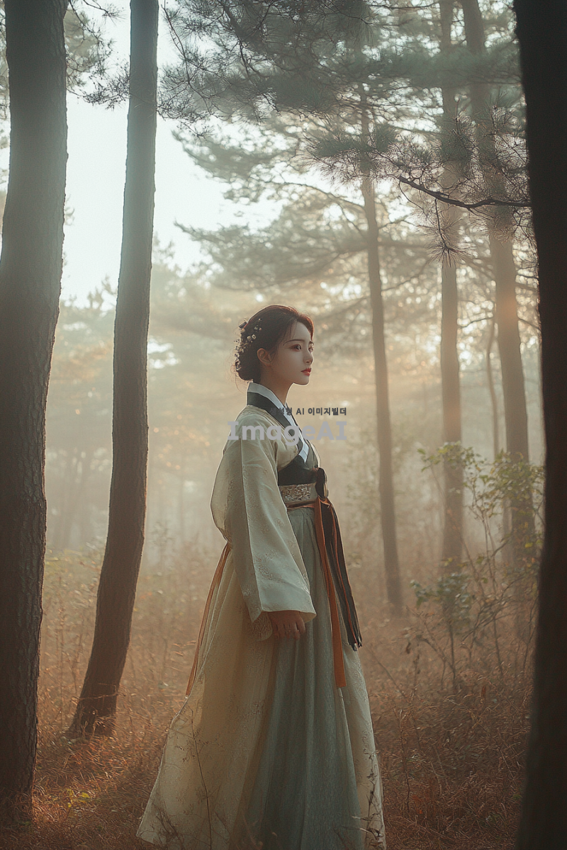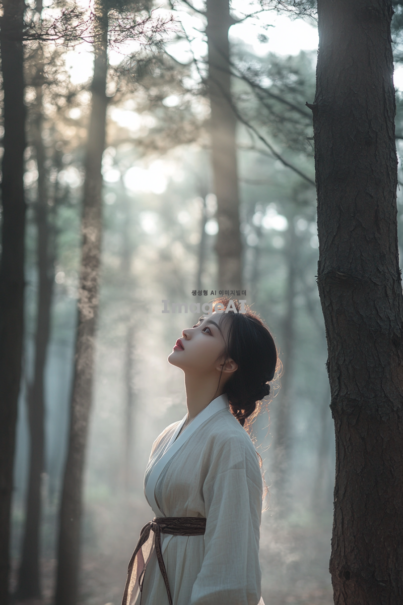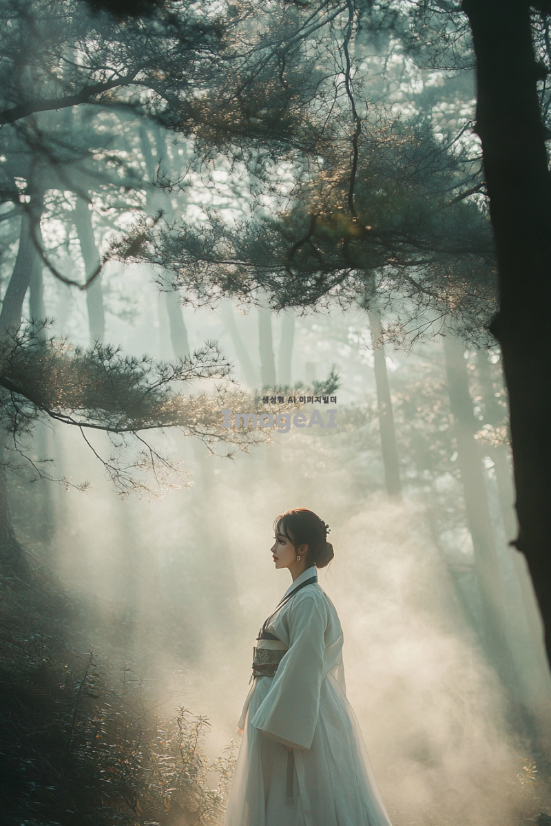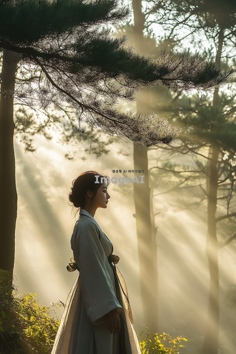 신비로운 숲속에 서 있는 20대 젊고 매력적인 여성, 소나무의 의인화. 한국 전통 복식을 현대적으로 재해석한 옷을 입고 있으며, 곧고 우아하게 뻗은 나무들로 둘러싸인 장면. 주변에는 안개가 살짝 깔려 신비로운 분위기를 더하고, 부드러운 햇살이 나무 사이로 스며들어 따뜻한 느낌을 줌. 한국 전통 미술에서 영감을 받은 색감과 구도를 사용하여 자연의 경이로움을 강조한 이미지.