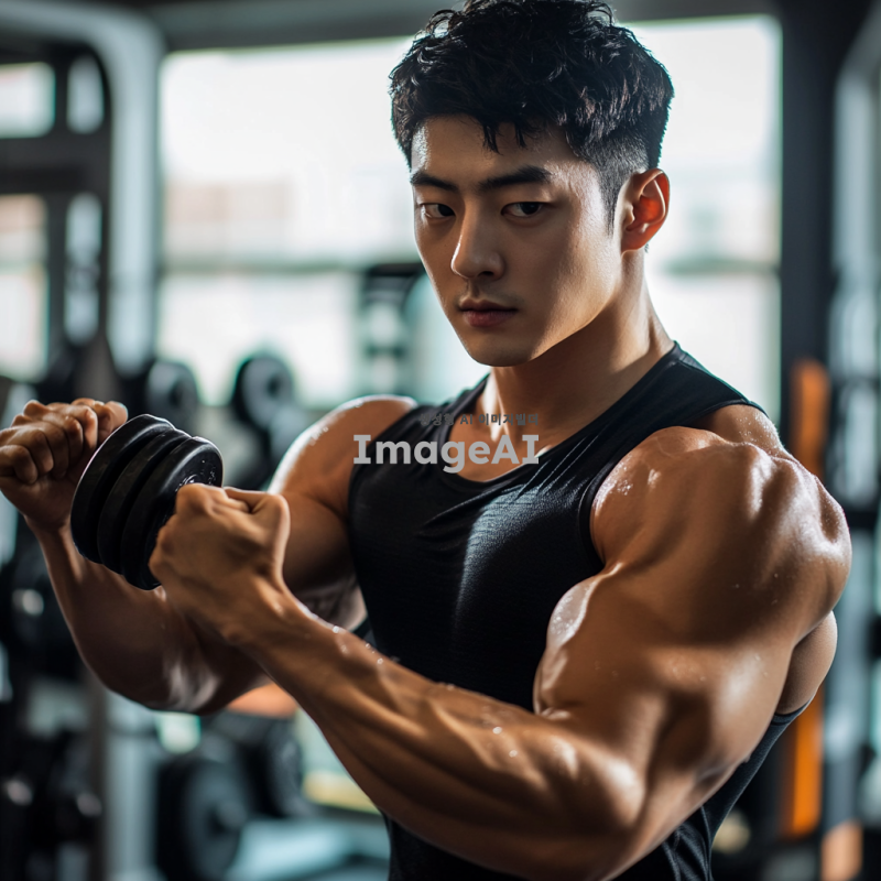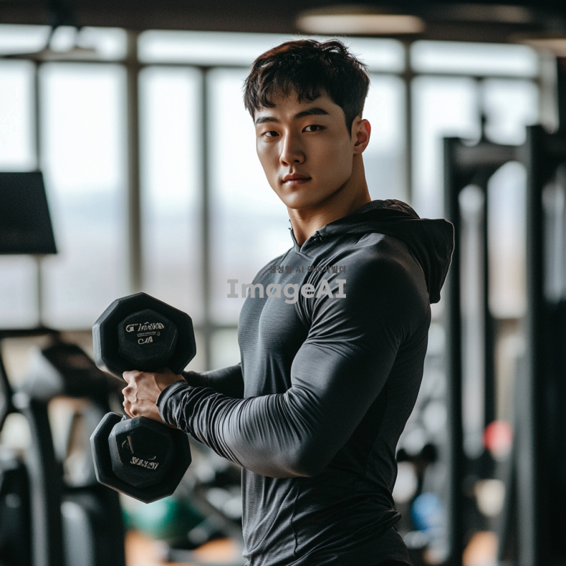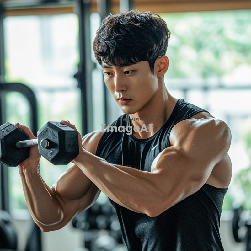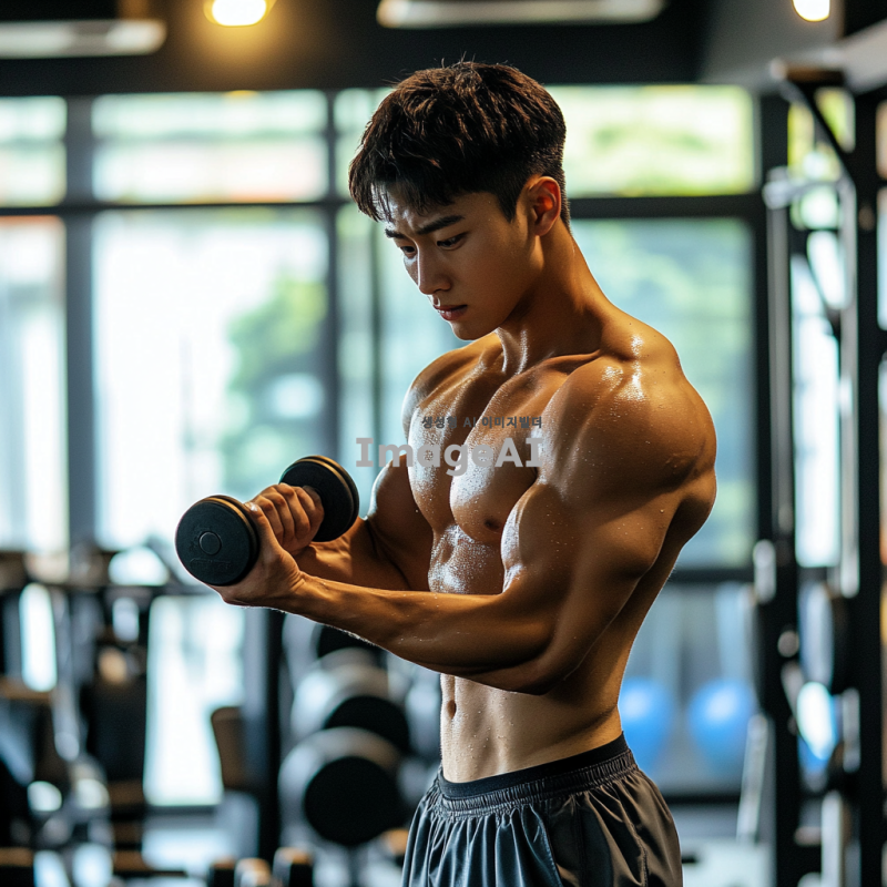 밝은 체육관에서 손목 컬 운동을 하고 있는 젊은 한국 남성, 집중한 표정, 땀으로 빛나는 피부, 손목에 덤벨을 잡고 있는 모습, 근육의 디테일이 강조된 팔, 스포티한 복장, 주변에 다양한 운동 기구들이 배치된 모습, 자연광이 들어오는 창문, 활기찬 분위기.