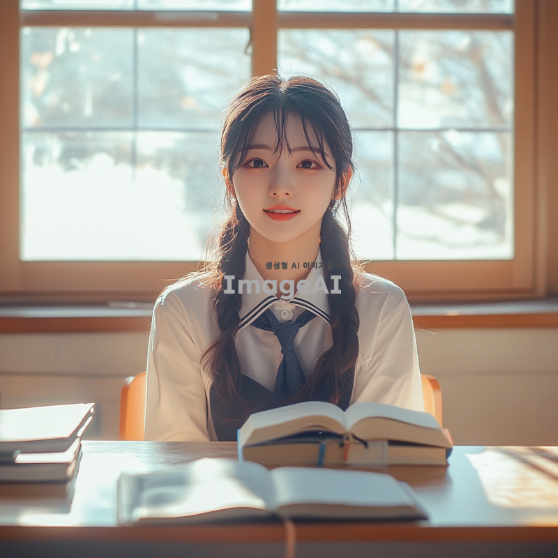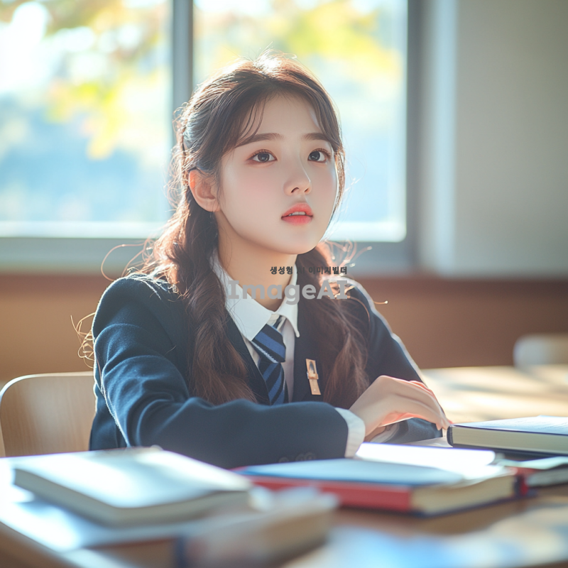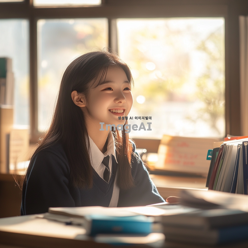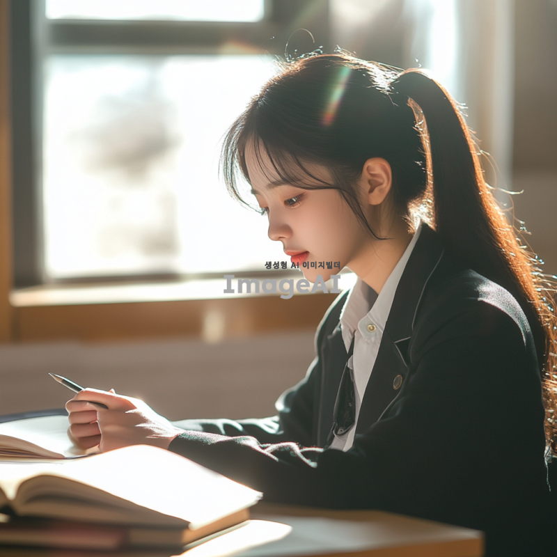 교복을 입고 있는 한국 여고생, 밝고 활기찬 표정, 교실에서 책상에 앉아 공부하는 모습, 창밖으로 햇살이 비치는 배경, 책과 노트가 책상 위에 놓여 있는 장면, 자연스러운 포즈와 생동감 있는 분위기.