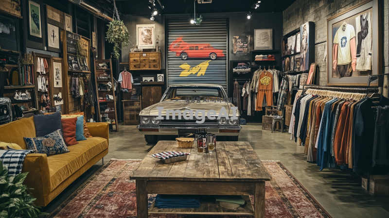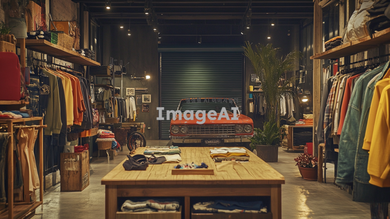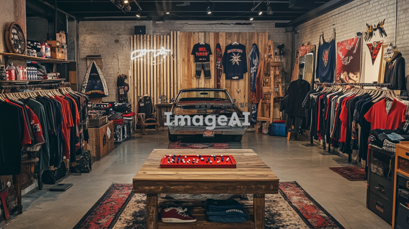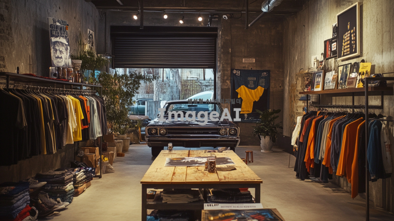 올드스쿨 힙합 스타일의 패션 브랜드 팝업스토어 내부, 게러지 홈파티 테마로 꾸며진 공간. 옷이 걸려 있는 행어들이 곳곳에 배치되어 있으며, 매장 중앙에는 비어퐁 게임이 세팅된 원목 테이블이 자리 잡고 있다. 전체적으로 와일드하고 자유분방한 분위기가 느껴지며, 더러운 느낌의 차량 셔터가 배경에 보인다. 클래식 카 한 대가 매장 한쪽에 주차되어 있어 빈티지한 매력을 더한다.