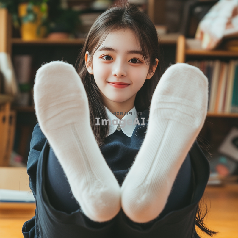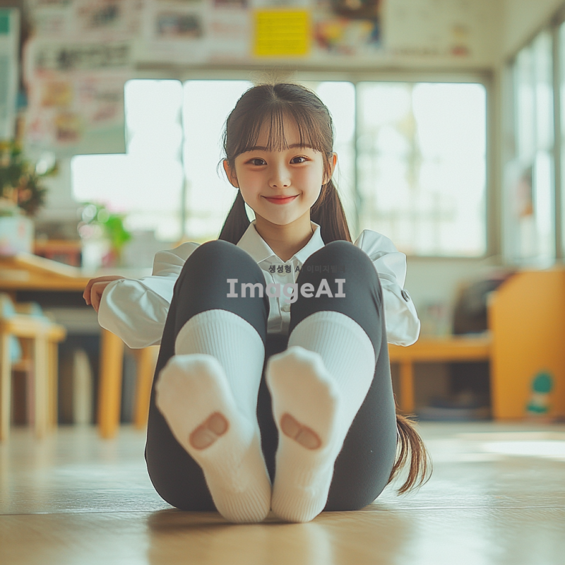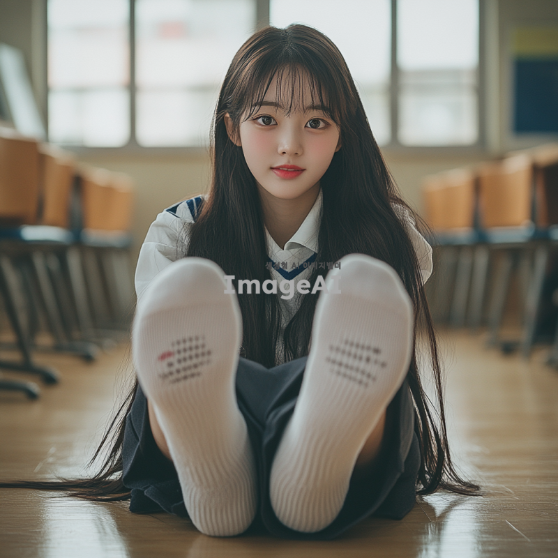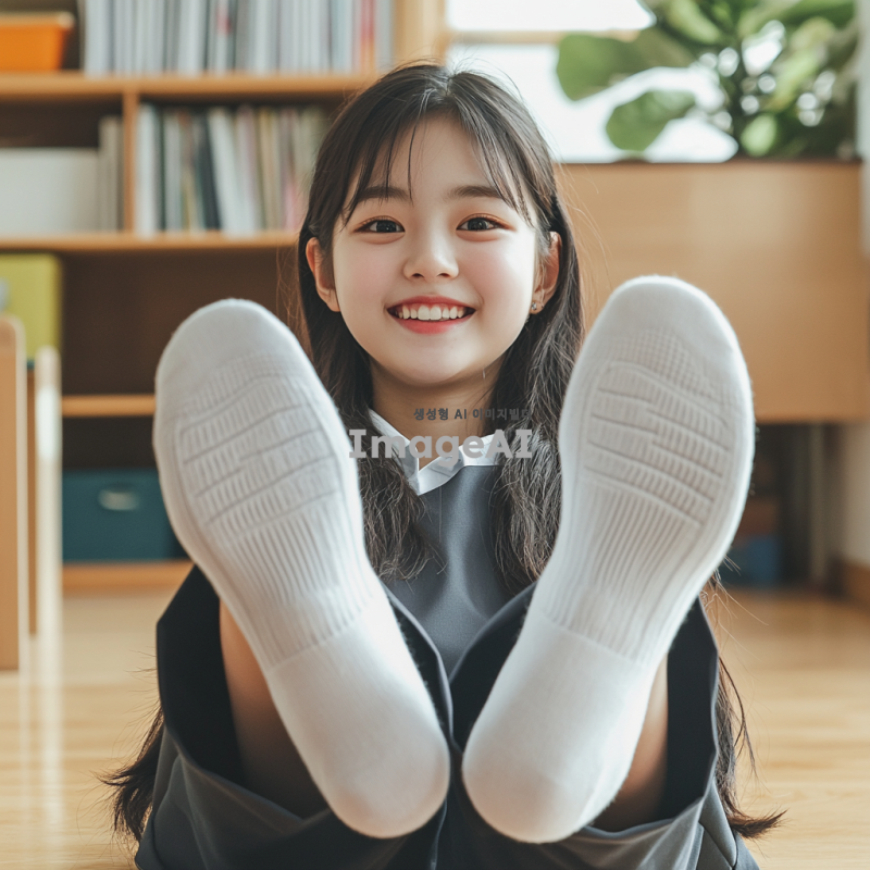 한국 중학생 소녀가 밝고 쾌활한 표정으로 앉아 있는 모습, 흰 양말을 신은 발을 앞으로 내밀어 발바닥이 보이도록 포즈를 취하고 있음, 교복을 입고 있으며, 주변은 학교 교실의 분위기, 자연스러운 조명과 따뜻한 색감, 발랄하고 친근한 느낌.