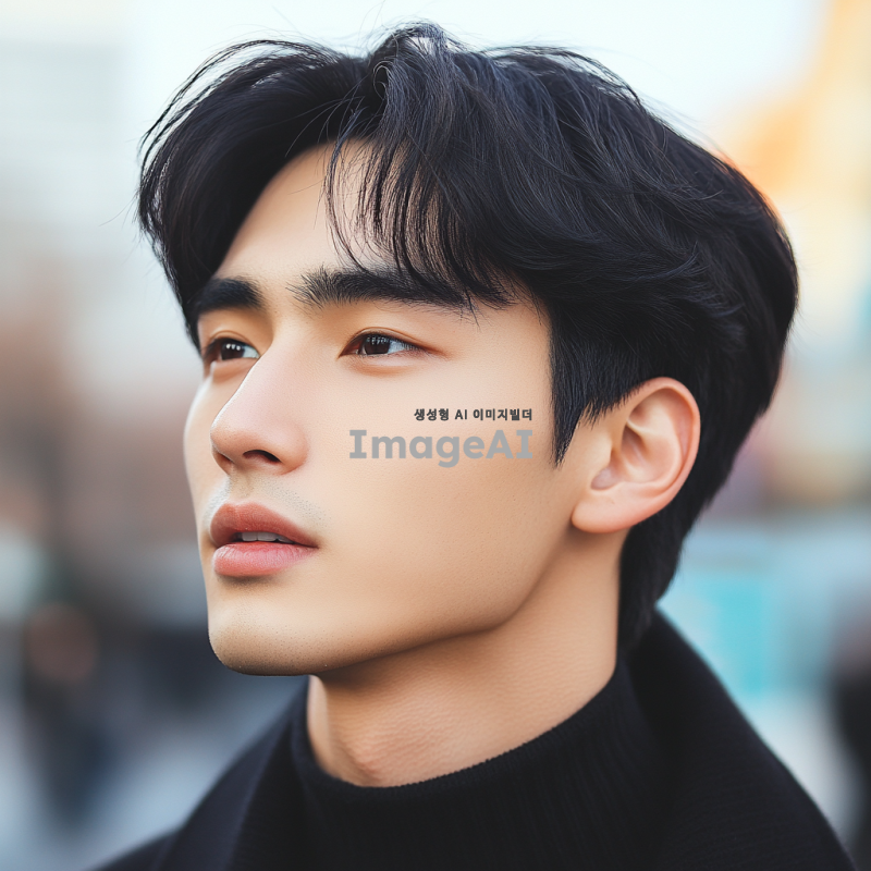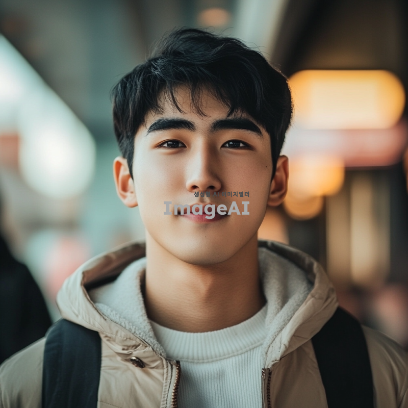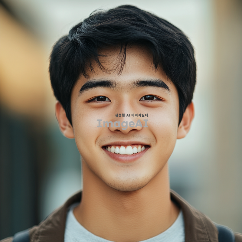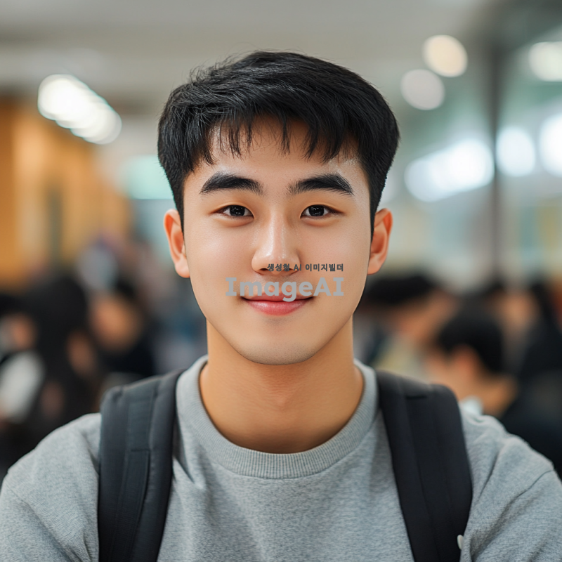 한국의 검은 머리와 검은 눈동자를 가진 잘생긴 남학생의 얼굴, 깨끗하고 매끈한 피부, 부드러운 미소, 세련된 헤어스타일, 자연스러운 조명과 배경, 현대적이고 스타일리시한 분위기.