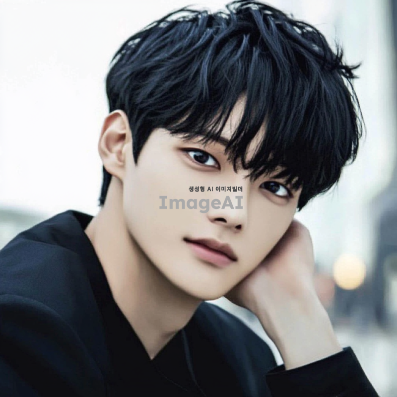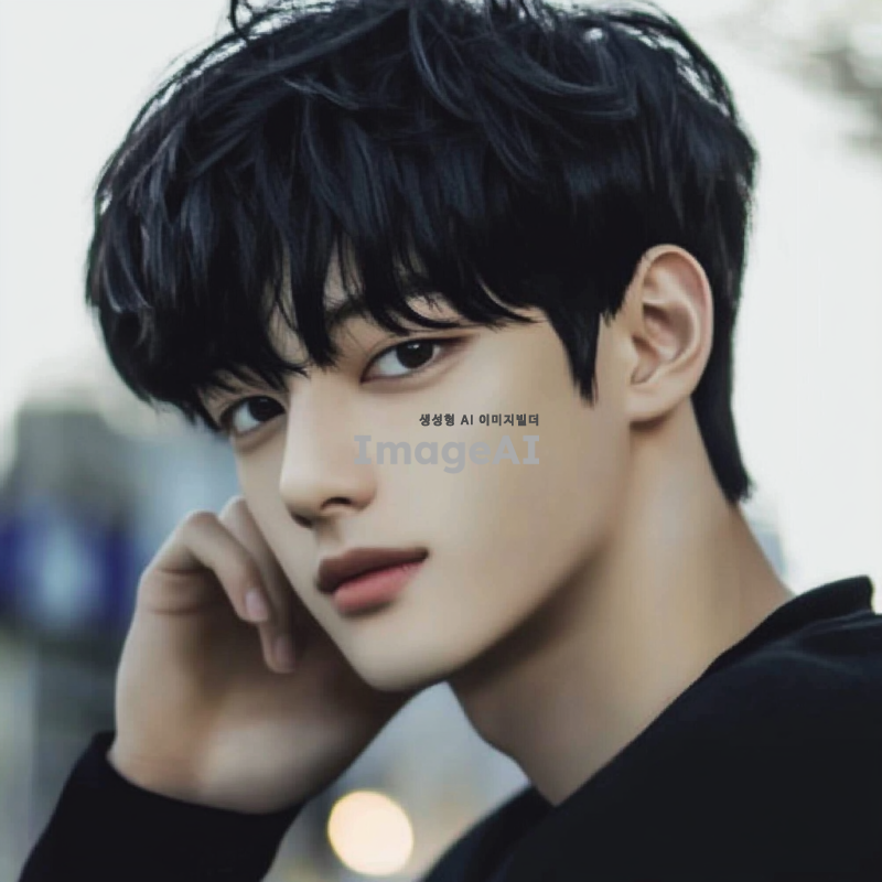 잘생긴 한국 남학생의 얼굴, 검은 머리, 검은 눈동자, 깨끗하고 매끈한 피부, 부드러운 미소, 자연스러운 조명, 배경은 흐릿한 도시 풍경.