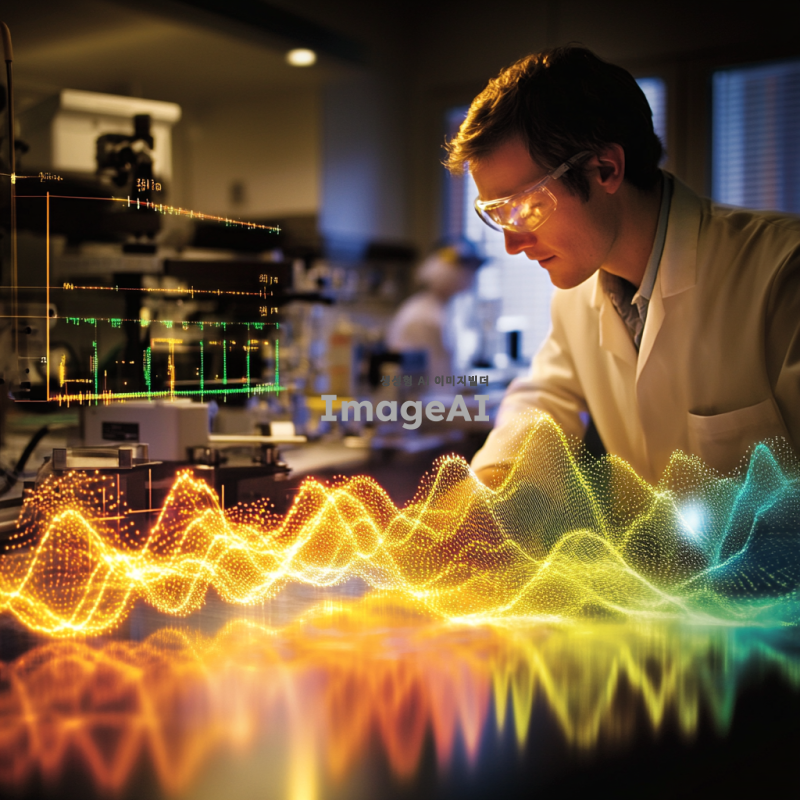 금 나노입자의 표면 플라스몬 공명(SPR) 효과를 시각적으로 표현한 이미지. 금 나노입자가 빛과 상호작용하여 전자들이 진동하는 모습을 중심으로, 빛의 파장에 따라 나노입자의 색이 변하는 장면을 포함. 배경은 실험실 환경으로, 다양한 과학 장비와 함께 연구자가 관찰하는 모습. 나노입자의 크기와 형태에 따른 SPR 효과의 차이를 강조하여, 각각의 나노입자가 다른 색으로 나타나는 장면. 빛의 파장과 나노입자 간의 상호작용을 설명하는 그래프나 도표를 추가하여 과학적 이해를 돕는 요소 포함.