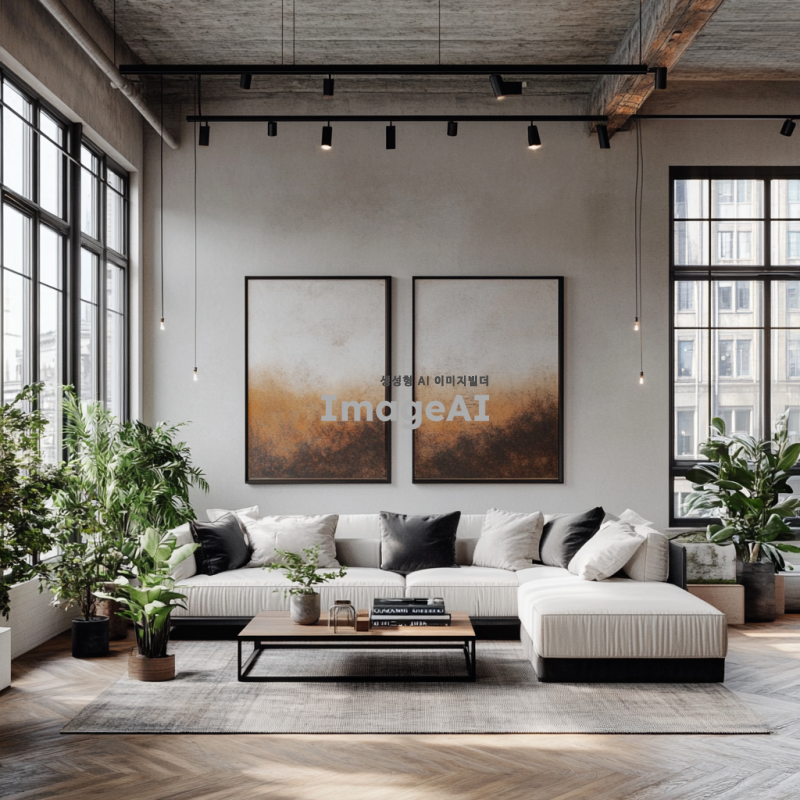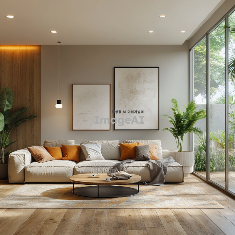 거실 내부, 현대적인 스타일, 넓은 창문으로 자연광이 들어오는 밝은 공간, 편안한 소파와 커피 테이블이 중앙에 배치되어 있으며, 벽에는 미니멀한 아트 작품들이 걸려 있음. 바닥은 따뜻한 색조의 나무 마루, 식물들이 곳곳에 배치되어 자연스러운 분위기 연출. 조명은 천장에 설치된 모던한 디자인의 펜던트 조명.