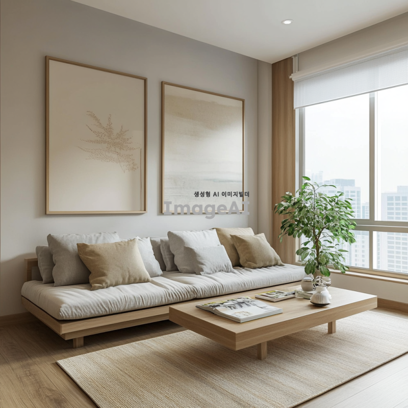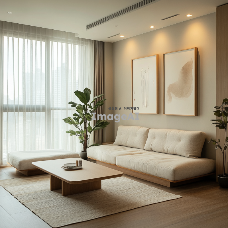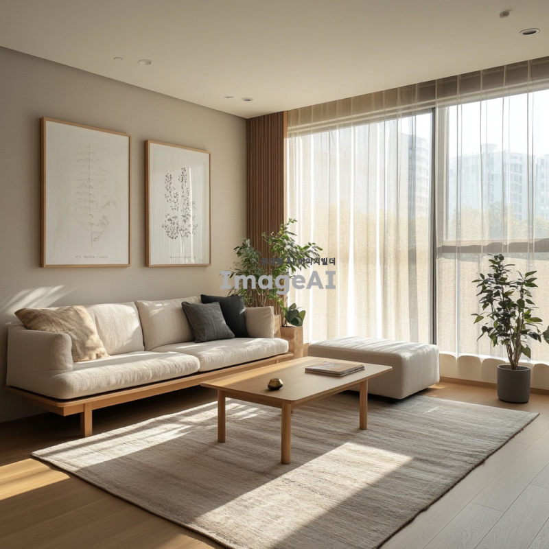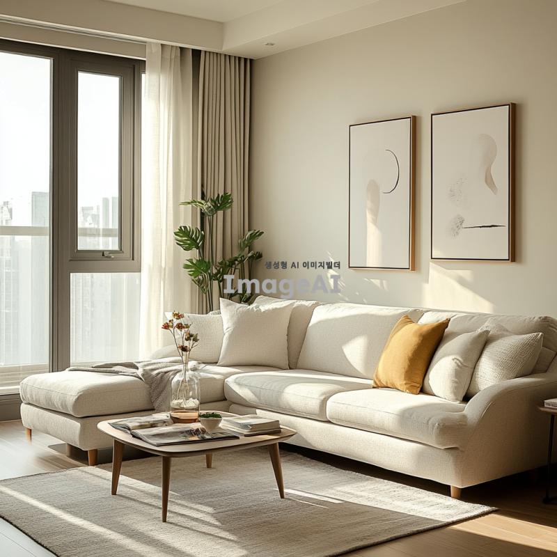 현대적인 한국 아파트의 거실을 배경으로, 세련된 디자인의 소파와 커피 테이블이 배치되어 있으며, 창문을 통해 자연광이 부드럽게 들어오는 장면. 벽에는 미니멀한 아트워크가 걸려 있고, 바닥에는 부드러운 색상의 러그가 깔려 있다. 코너에는 실내 식물이 배치되어 있어 자연스러운 분위기를 더한다.