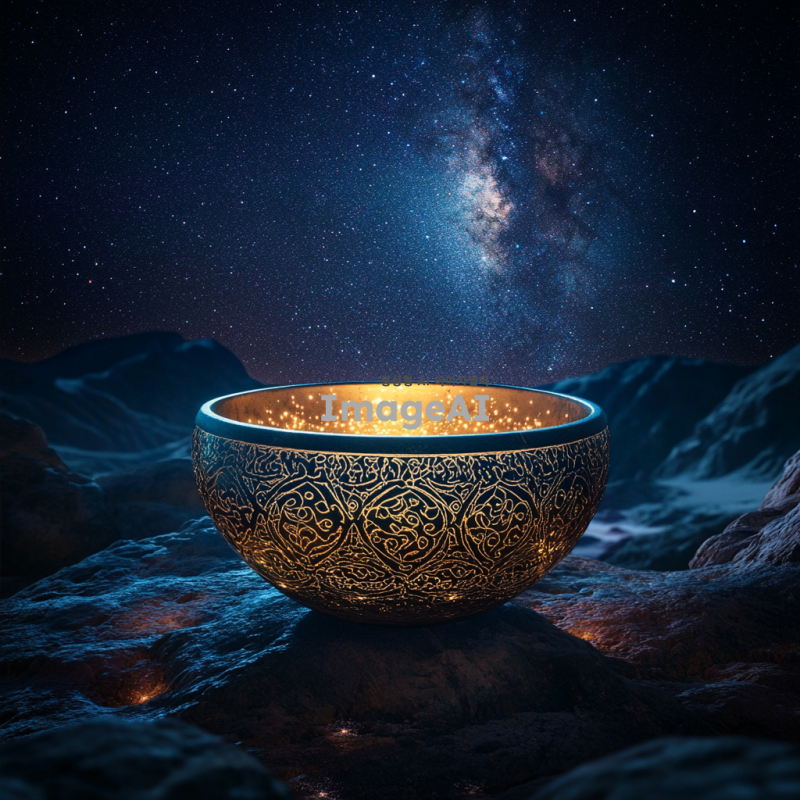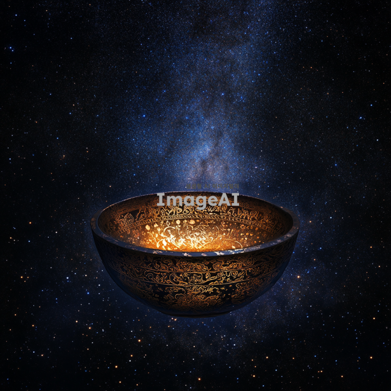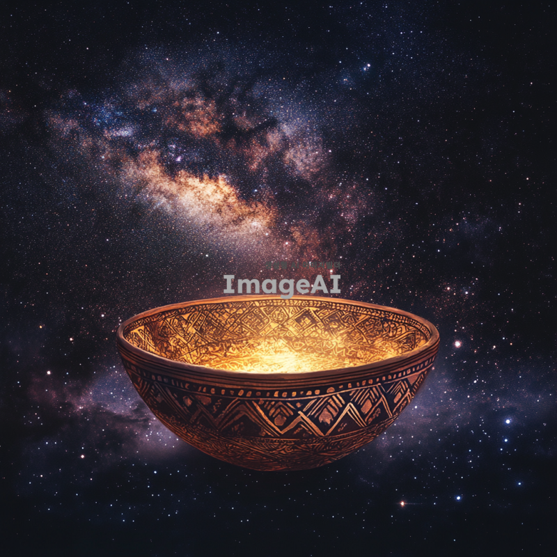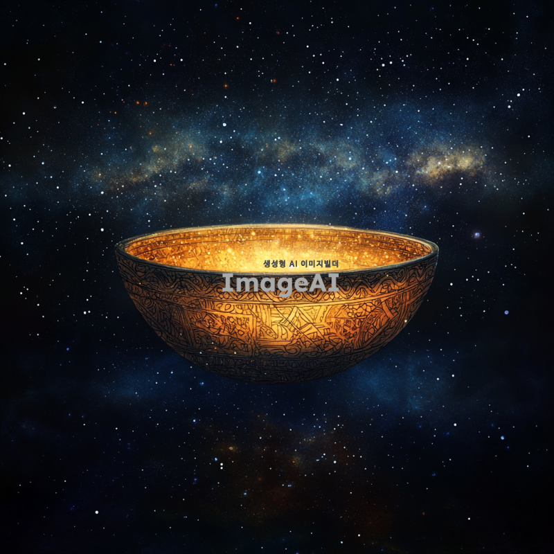 우주를 배경으로 한 신비로운 분위기의 이미지, 중앙에 빛나는 그릇이 떠 있는 모습, 그릇은 고대 도자기 스타일로 정교하게 장식되어 있으며, 은하수와 별들이 그릇 주위를 감싸고 있는 장면, 어두운 밤하늘과 반짝이는 별들이 조화를 이루어 신비롭고 철학적인 느낌을 강조, 그릇의 표면에는 우주와 연결된 듯한 패턴이 새겨져 있는 모습, 전체적으로 차분하고 영감을 주는 분위기.