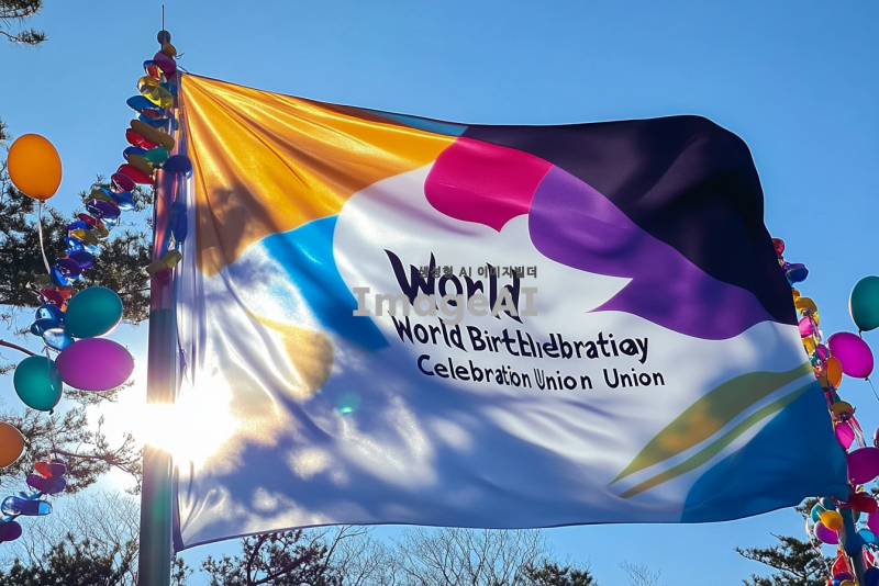 세계생일축하연합이라는 문구가 중앙에 크게 쓰여 있는 네모난 깃발, 바람에 펄럭이는 모습, 밝고 생동감 있는 색상, 깃발의 배경은 축제 분위기를 연상시키는 디자인, 깃발의 가장자리에 다양한 색상의 풍선과 리본 장식, 깃발의 질감은 부드럽고 자연스럽게 표현, 햇빛이 깃발에 비쳐 반짝이는 효과.