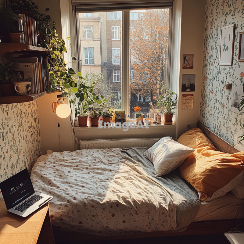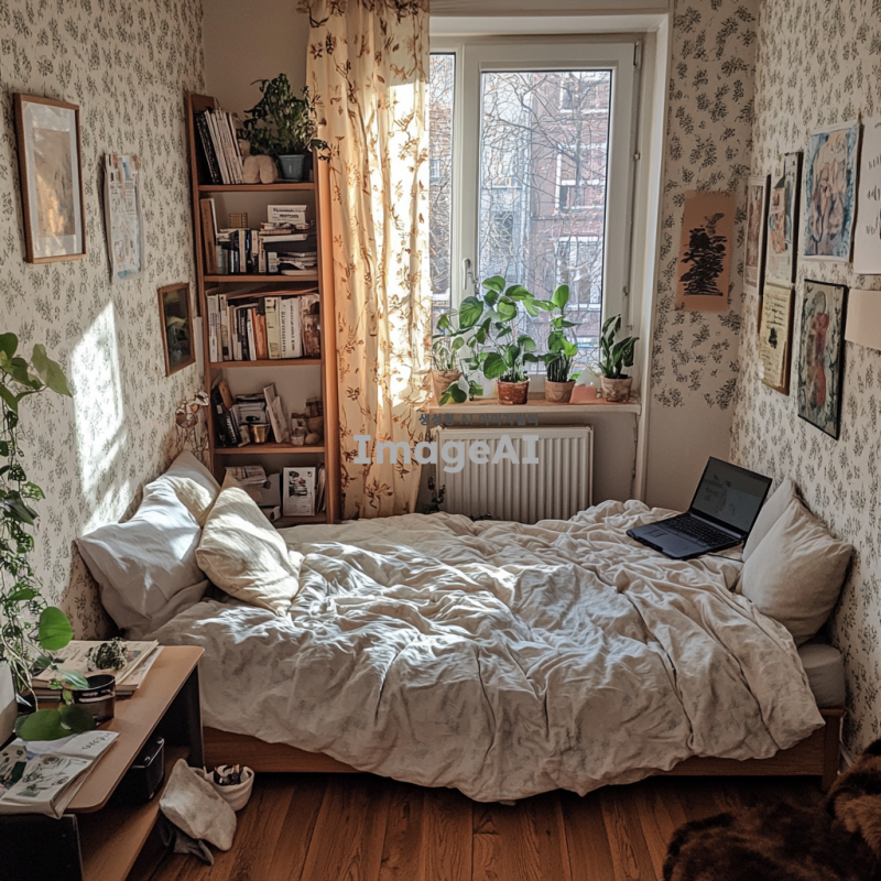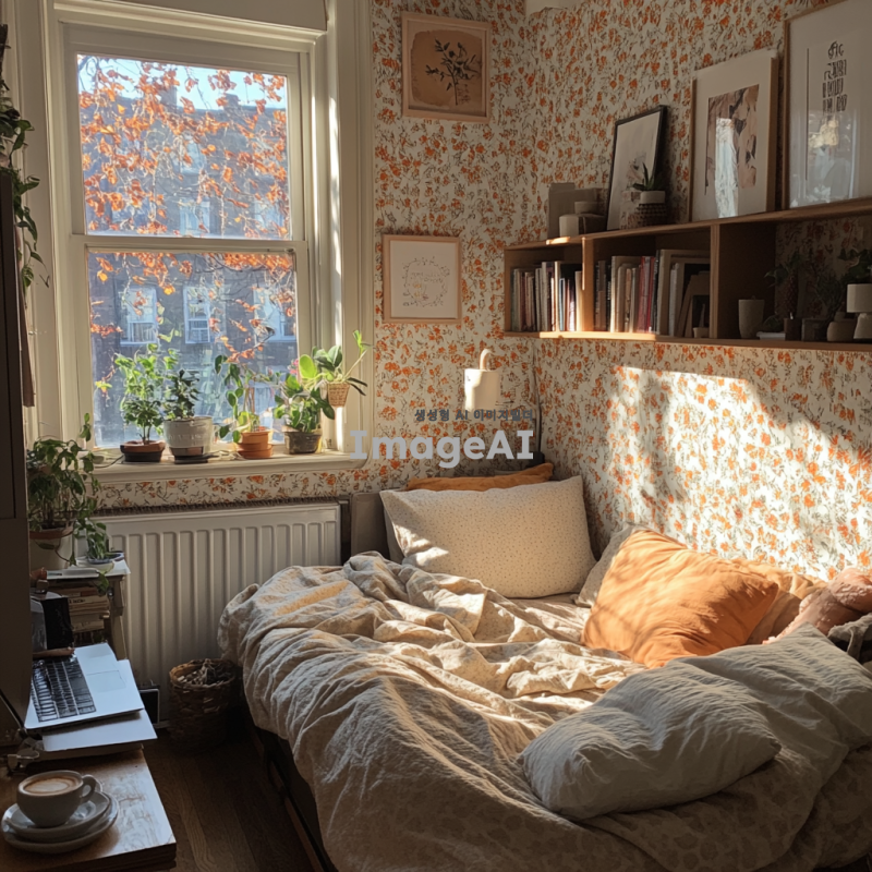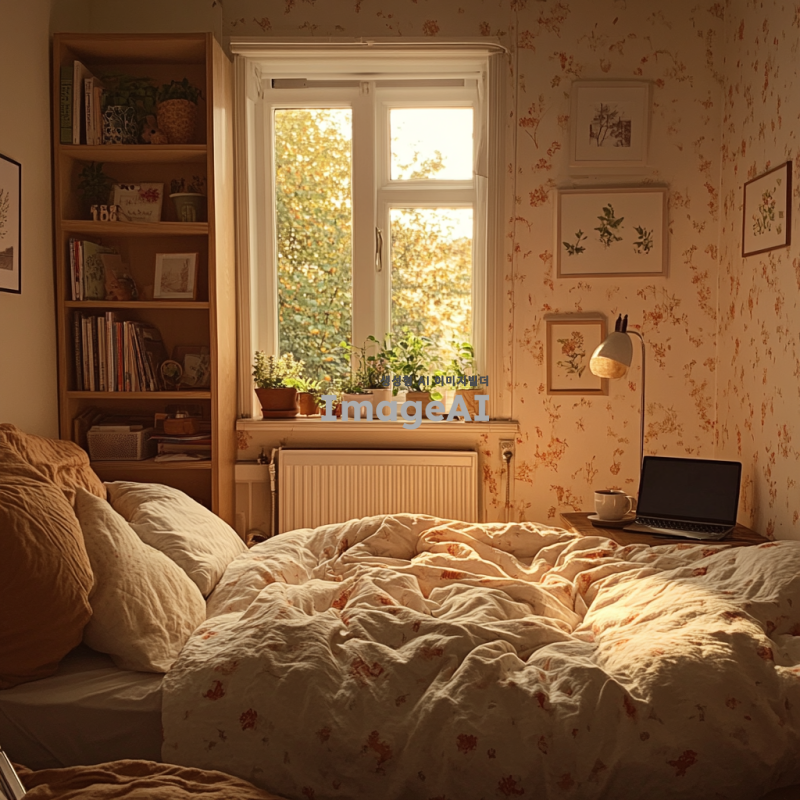 작은 창문으로 부드러운 햇살이 들어오는 아늑한 자취방, 따뜻한 색감의 벽지와 나무 바닥, 편안한 베개와 담요가 놓인 포근한 침대, 작은 화분과 책이 놓인 책장, 조명이 은은하게 비추는 스탠드 램프, 부드러운 질감의 러그가 깔린 바닥, 창가에 놓인 커피잔과 노트북, 벽에 걸린 아기자기한 그림들, 전체적으로 따뜻하고 평화로운 분위기.