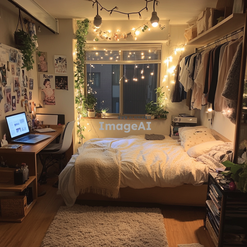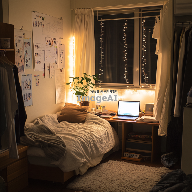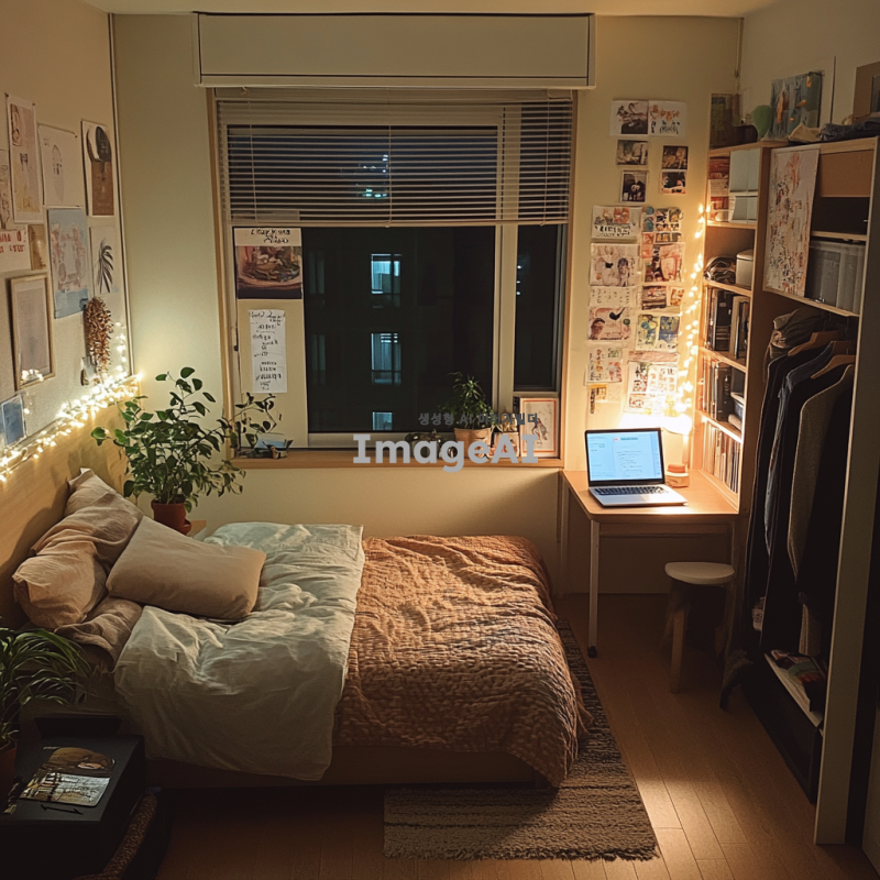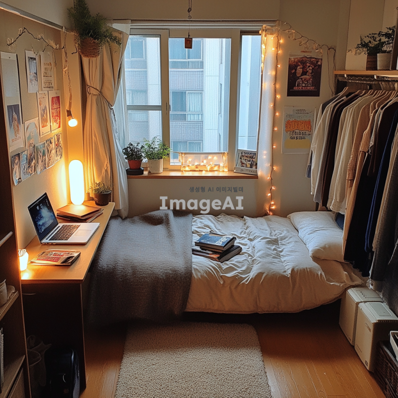 작은 크기의 아늑하고 포근한 20살 한국인의 첫 자취방, 따뜻한 조명이 드리워진 방 안, 벽에는 부드러운 색상의 포스터와 사진들, 창가에 작은 화분, 편안한 침대와 부드러운 담요, 작은 책상 위에 노트북과 책들, 바닥에는 부드러운 러그, 방 한쪽에는 옷걸이와 옷장, 전체적으로 따뜻하고 편안한 분위기.