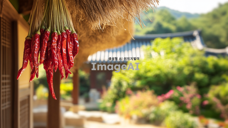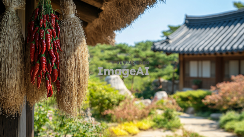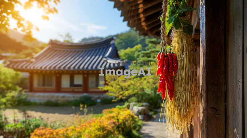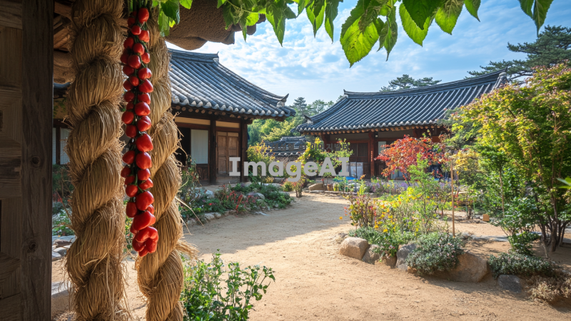 한국 전통 초가집 앞에 대문 처마에 고추가 매달린 금줄이 걸려 있는 장면, 주변에는 전통적인 분위기의 정원이 있고, 푸른 하늘 아래 초가집이 따뜻한 햇살을 받고 있는 모습, 초가집의 디테일과 정원의 조화로운 풍경이 강조된 이미지.