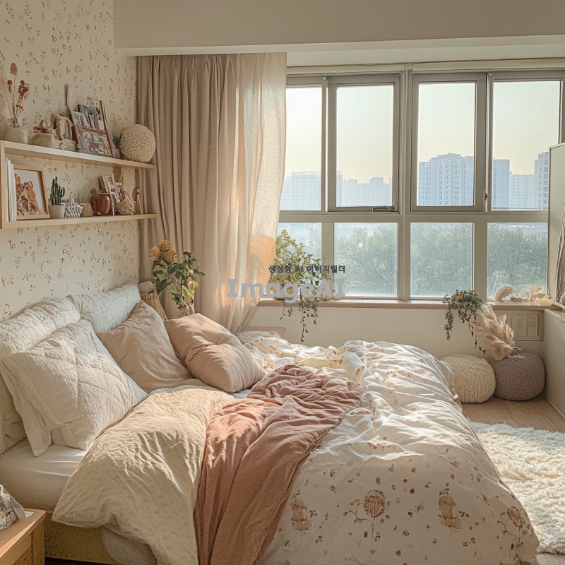 따뜻하고 아늑한 분위기의 20살 여성이 처음 자취하는 방, 벽에는 부드러운 파스텔 톤의 벽지가 있고, 창문으로 들어오는 자연광이 방을 환하게 비추는 모습, 방 한쪽에는 아기자기한 장식품이 있는 책장과 작은 화분들이 놓여 있으며, 편안한 소파와 쿠션이 있는 작은 거실 공간, 침대에는 푹신한 이불과 귀여운 베개가 놓여 있는 따뜻한 느낌의 침실, 바닥에는 부드러운 러그가 깔려 있어 포근한 느낌을 주는 방, 전체적으로 깔끔하고 정돈된 인테리어, 창문 밖으로는 맑은 하늘과 푸른 나무들이 보이는 장면.