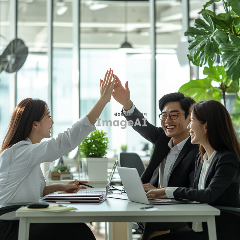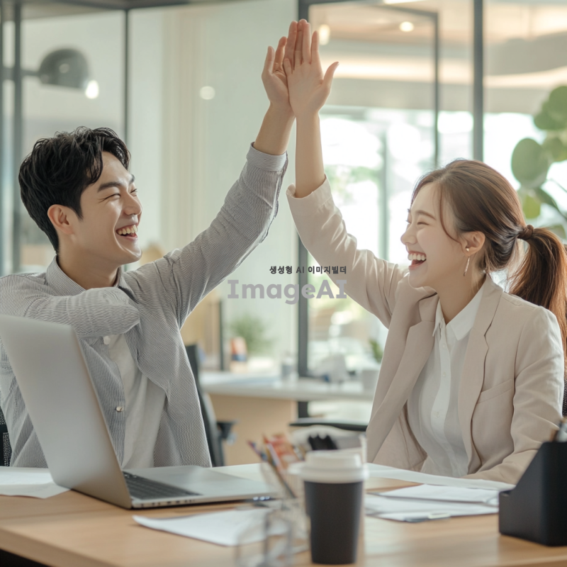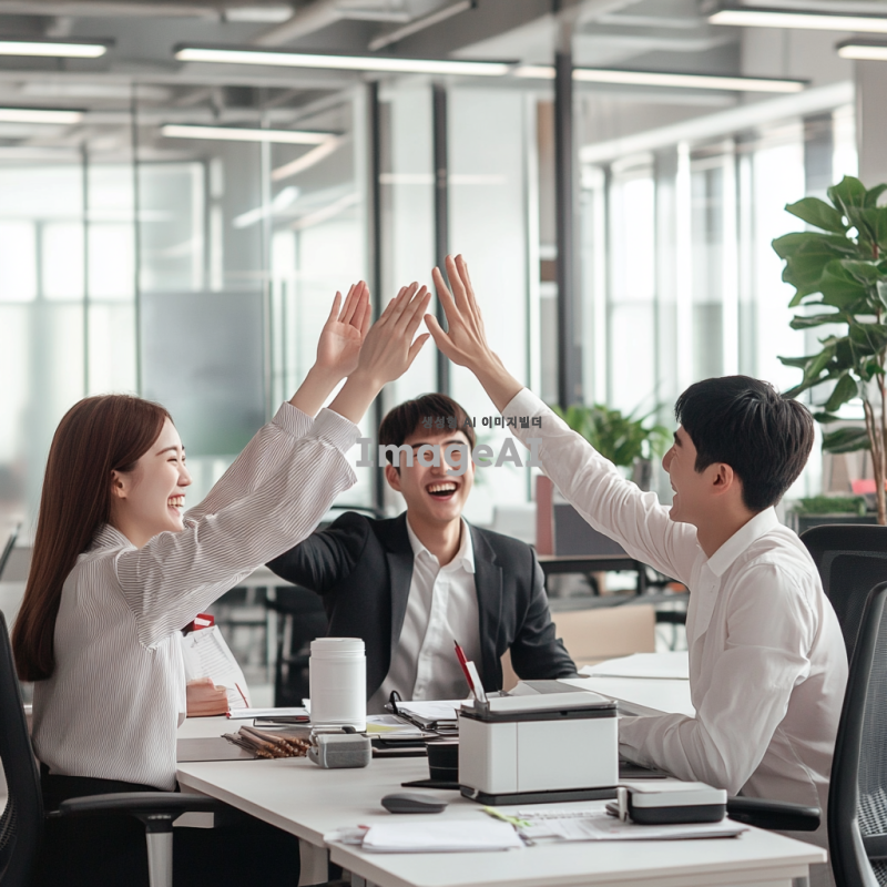 현대적인 화이트톤의 깔끔한 오피스 배경, 책상에 앉아 있는 직장인들이 연차를 사용하고 기뻐하는 모습, 밝은 미소와 함께 서로 하이파이브를 하는 장면, 컴퓨터 화면에 연차 승인 메시지가 떠 있는 상황, 캐주얼한 복장과 함께 편안한 분위기의 사실적인 사진, 한국인 직장인들, 자연스러운 조명과 디테일한 표현