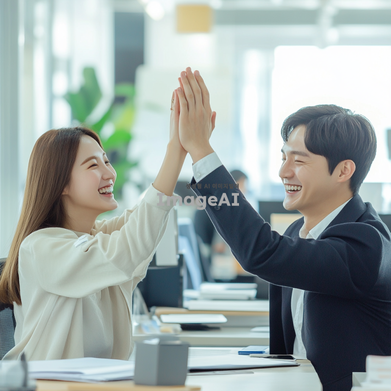 현대적인 화이트톤의 깔끔한 오피스 배경, 책상에 앉아 있는 한국인 직장인들이 연차를 사용하고 기뻐하는 모습, 밝은 미소와 함께 서로 하이파이브를 하는 장면, 캐주얼한 복장과 함께 편안한 분위기의 사실적인 사진, 자연스러운 조명과 디테일한 표현.