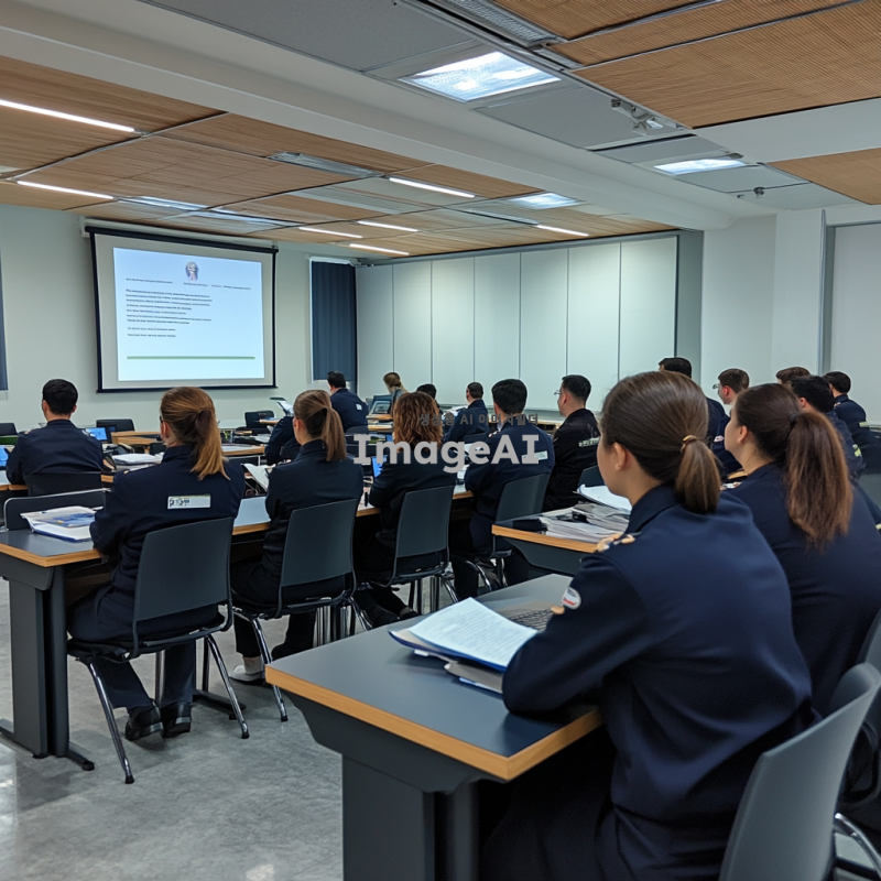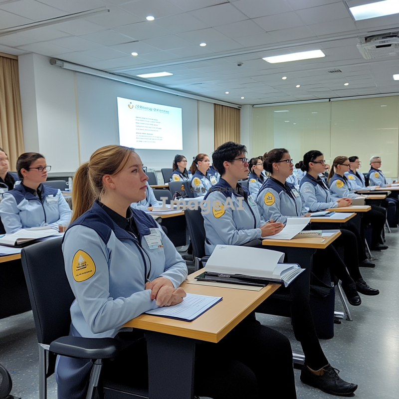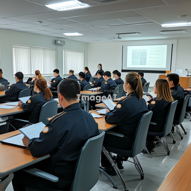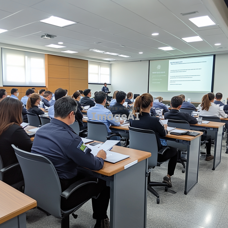 현대적인 사내 강의실에서 유니폼을 입고 앉아 있는 직원들, 집중해서 강의를 듣고 있는 모습, 강의실은 밝고 깔끔하며, 책상과 의자가 잘 정돈되어 있음, 직원들은 다양한 연령대와 성별로 구성되어 있으며, 각자의 노트에 메모를 하고 있는 모습, 강의실 앞에는 프레젠테이션 화면이 보이며, 교육 자료가 화면에 표시되어 있음