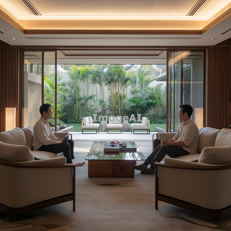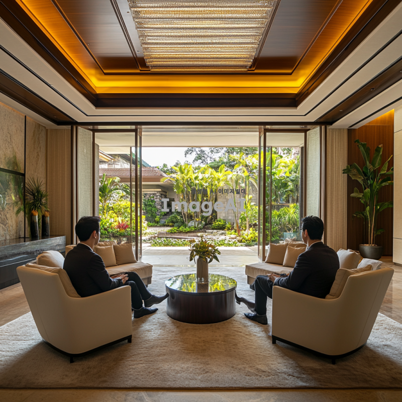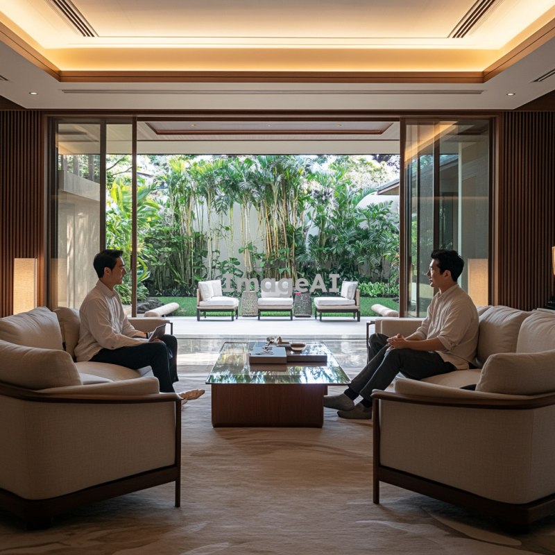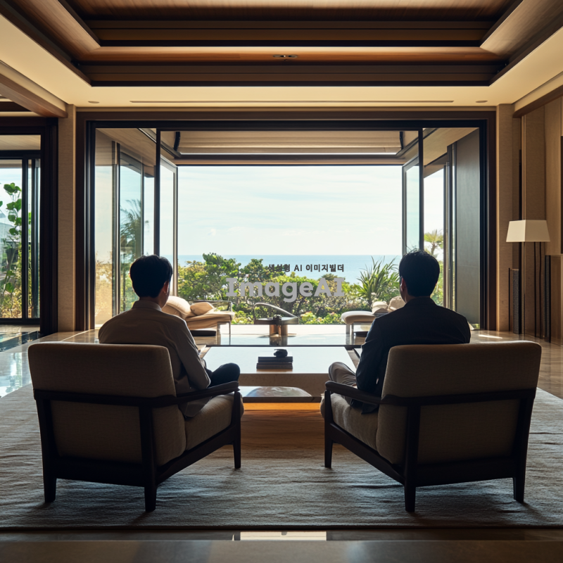 하와이대저택의 고급스러운 거실, 두 명의 한국인 남성이 1인용 소파에 서로 마주 보고 앉아 진지하게 대화를 나누는 장면, 방 안은 세련된 인테리어와 자연 채광이 어우러져 있으며, 편안하고 전문적인 분위기.