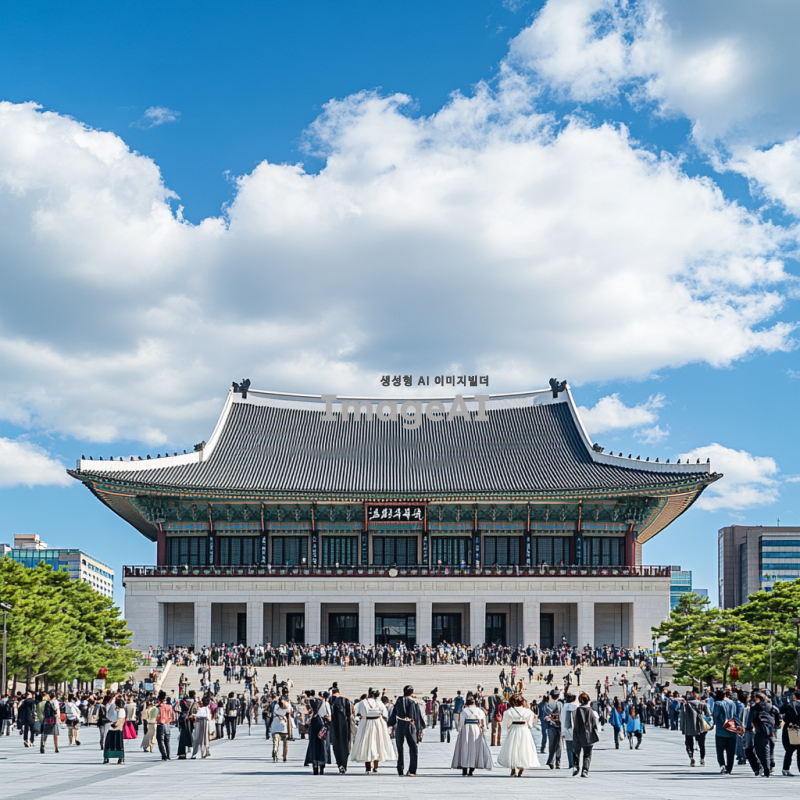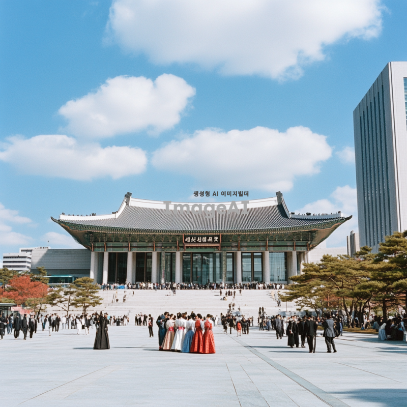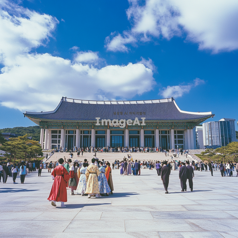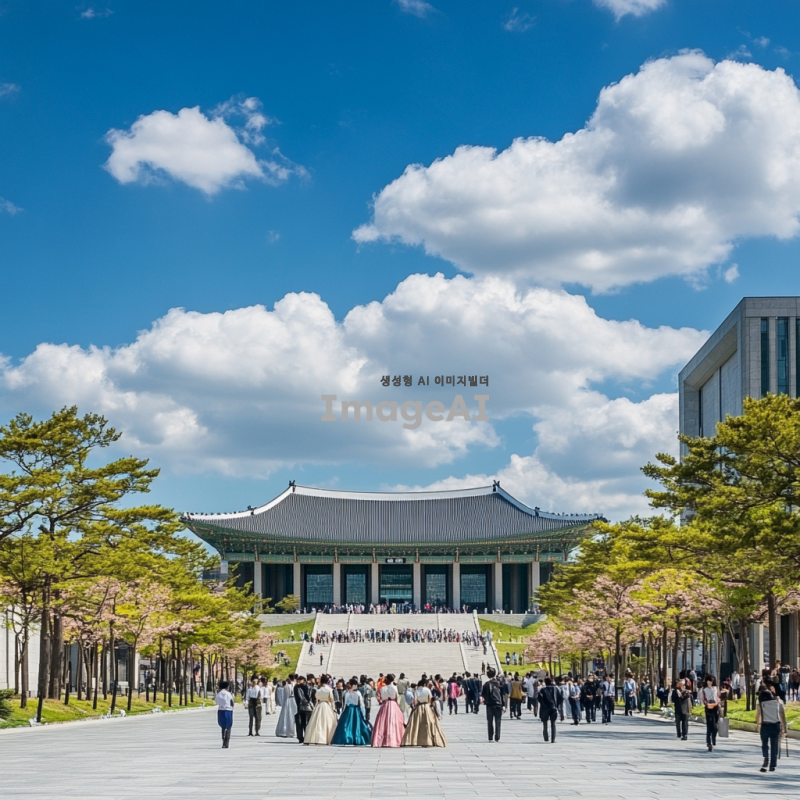 한국 국회의사당을 배경으로 한 현대적인 풍경, 푸른 하늘과 구름이 어우러진 날씨, 의사당 앞에 한국 전통 의상을 입은 사람들이 모여 있는 장면, 주변에 가로수가 늘어서 있고 사람들이 산책을 즐기는 모습, 건물의 웅장함과 현대적인 도시의 조화로운 느낌 강조.