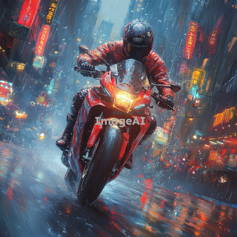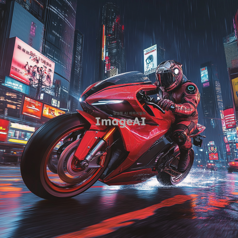 사이버펑크 도시 배경, 네온 불빛이 반짝이는 거리, 혼다 오토바이를 타고 있는 남성, 빠르게 드리프트하는 역동적인 모습, 아키라 명장면의 미래적인 분위기, 남성은 헬멧을 착용하고 있으며, 바람에 날리는 옷자락, 오토바이의 디테일한 기계적 요소, 도시의 고층 빌딩과 광고판, 어두운 밤 하늘에 반사되는 불빛, 원근감 있는 요소