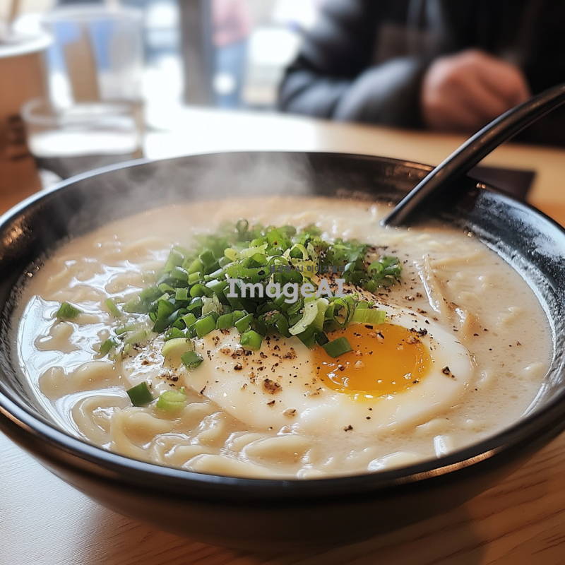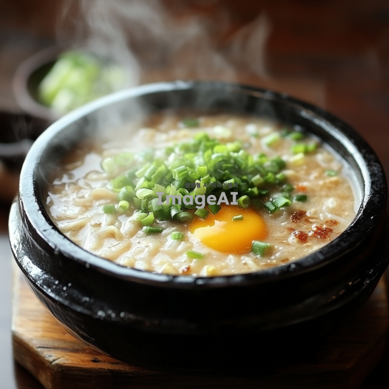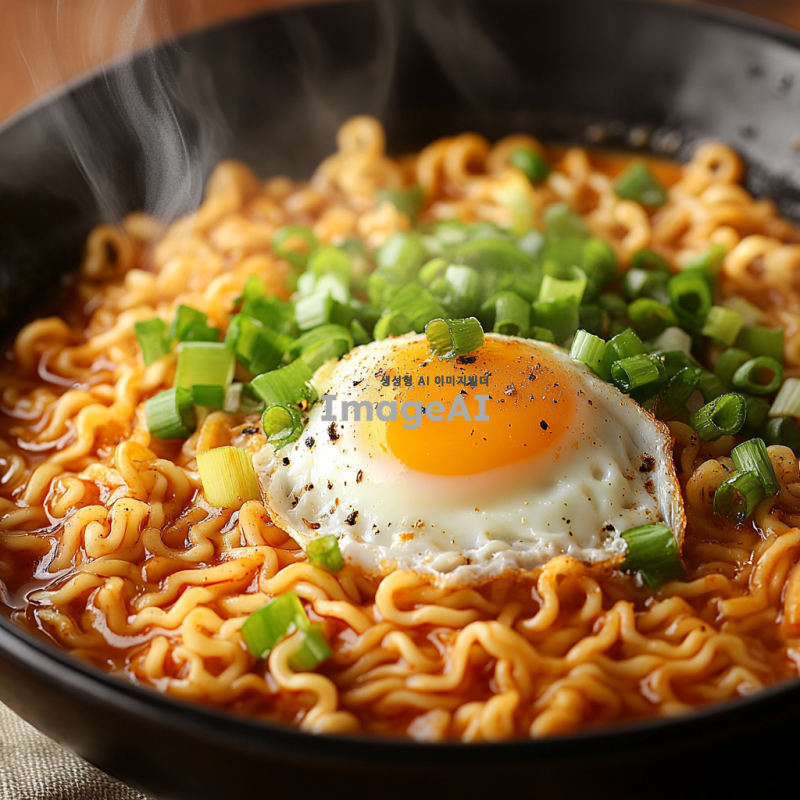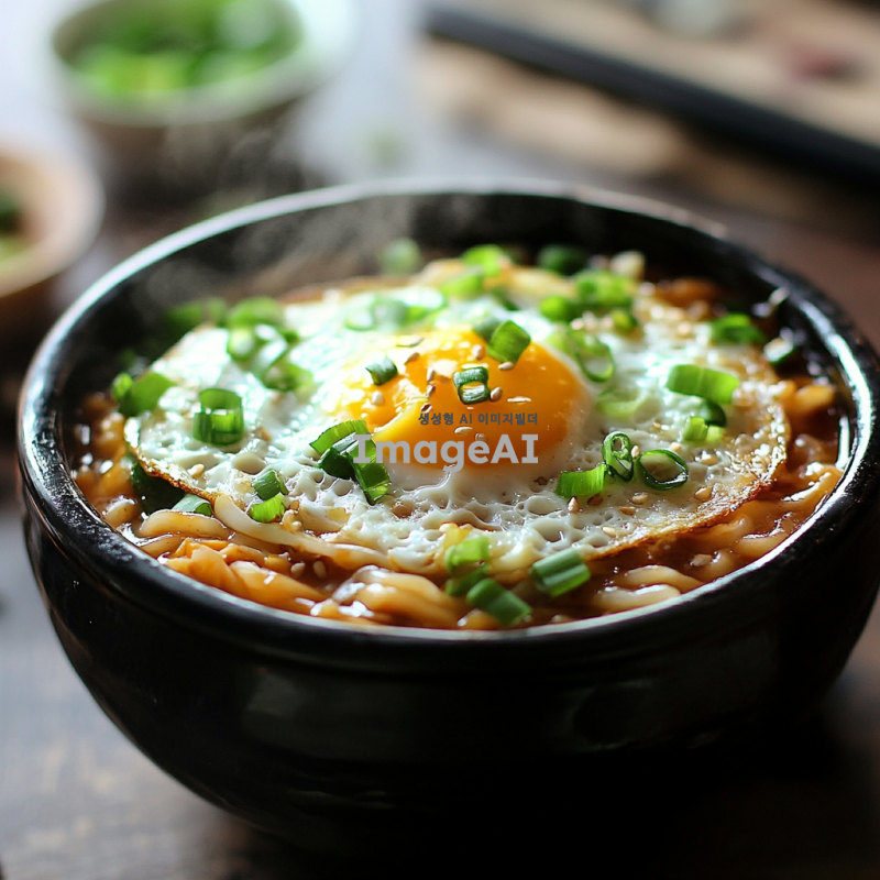 한국 라면이며, 따듯한 김이 모락모락 나고, 고명으로 파와 계란이 올라감