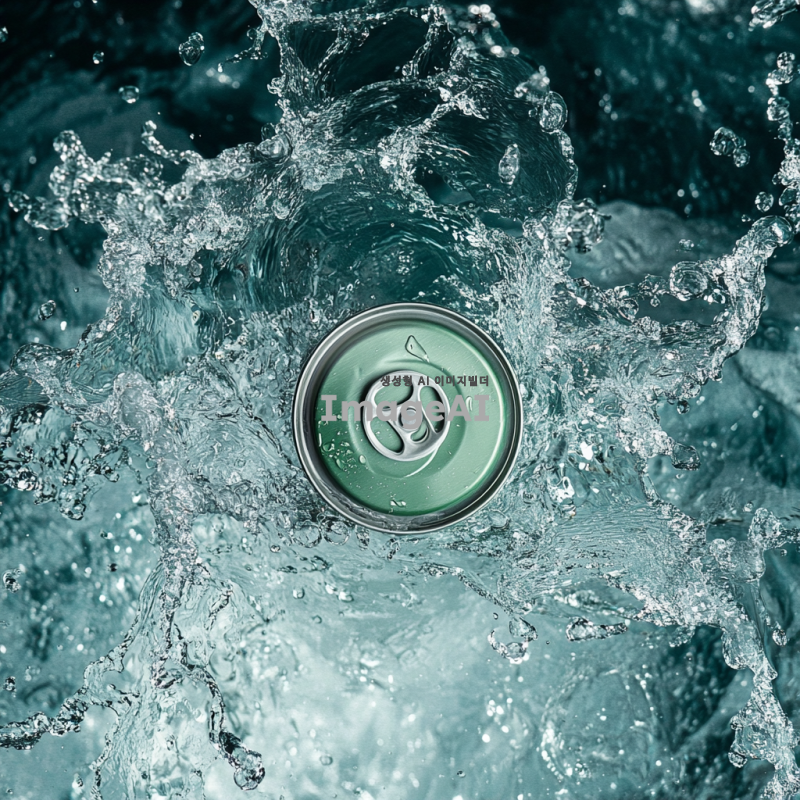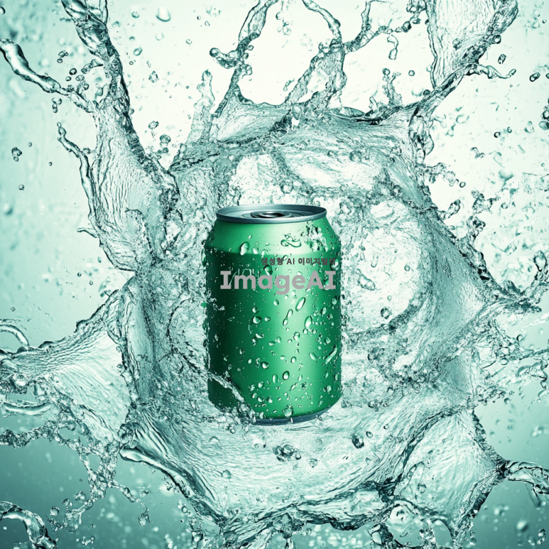 위에서 아래로 내려다보는 시점, 물이 튀기는 역동적인 장면, 중앙에 연한 녹색 캔 음료가 가로로 놓여 있고, 주변에 물이 튀기는 모습, 물방울이 생생하게 표현된 장면, 시원하고 청량한 느낌 강조.