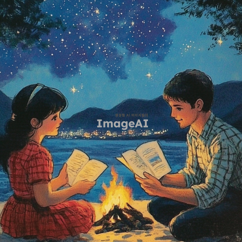 별이 빛나는 숲속에서 캠프파이어를 하며 대화를 나누는 남녀