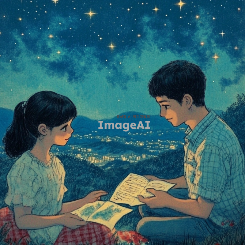 별이 빛나는 밤하늘 아래에서 대화를 나누는 남녀