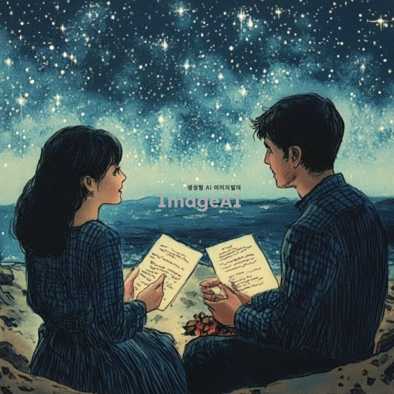 별이 가득한 밤하늘 아래, 해변가에 앉아 있는 남녀, 파도 소리를 들으며 서로의 이야기에 귀 기울이는 모습
