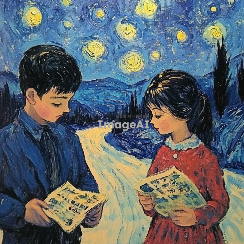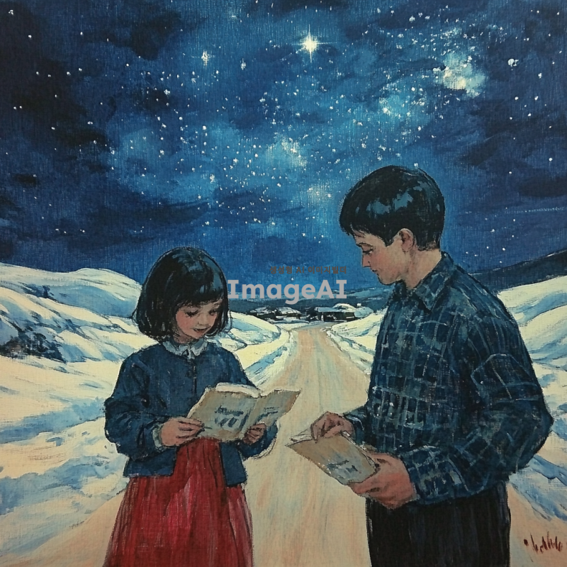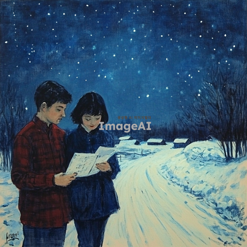 별이 빛나는 밤하늘을 보며 남녀가 시골 길 위를 걷고 있는 그림을 그려줘. 길은 사진의 한가운데에 있어. 그리고 겨울 분위기가 났으면 좋겠어. 눈이 쌓여 있는거야.