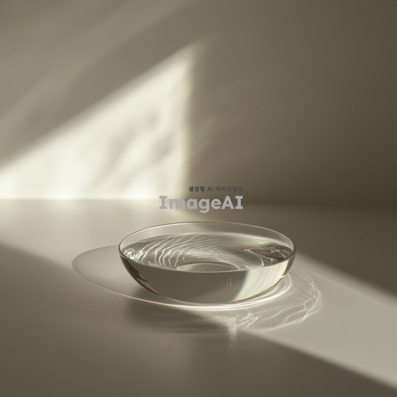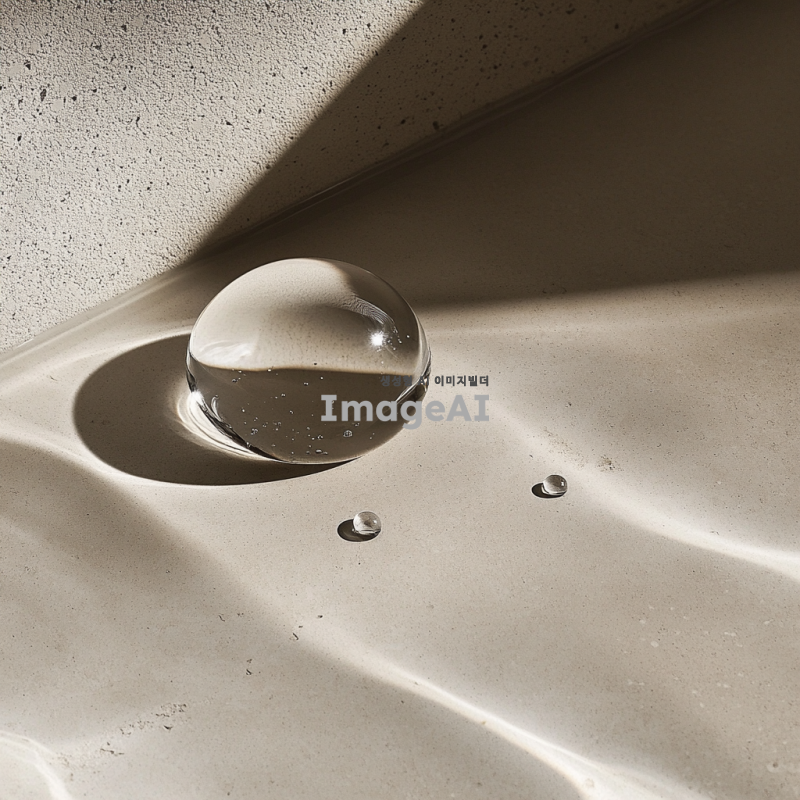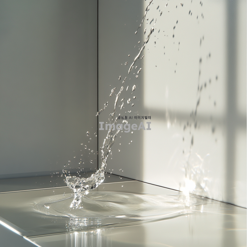 물방울이 유리 표면에 닿아 퍼지는 순간을 포착, 깔끔하고 미니멀한 구성, 자연스러운 조명과 그림자 효과 강조.