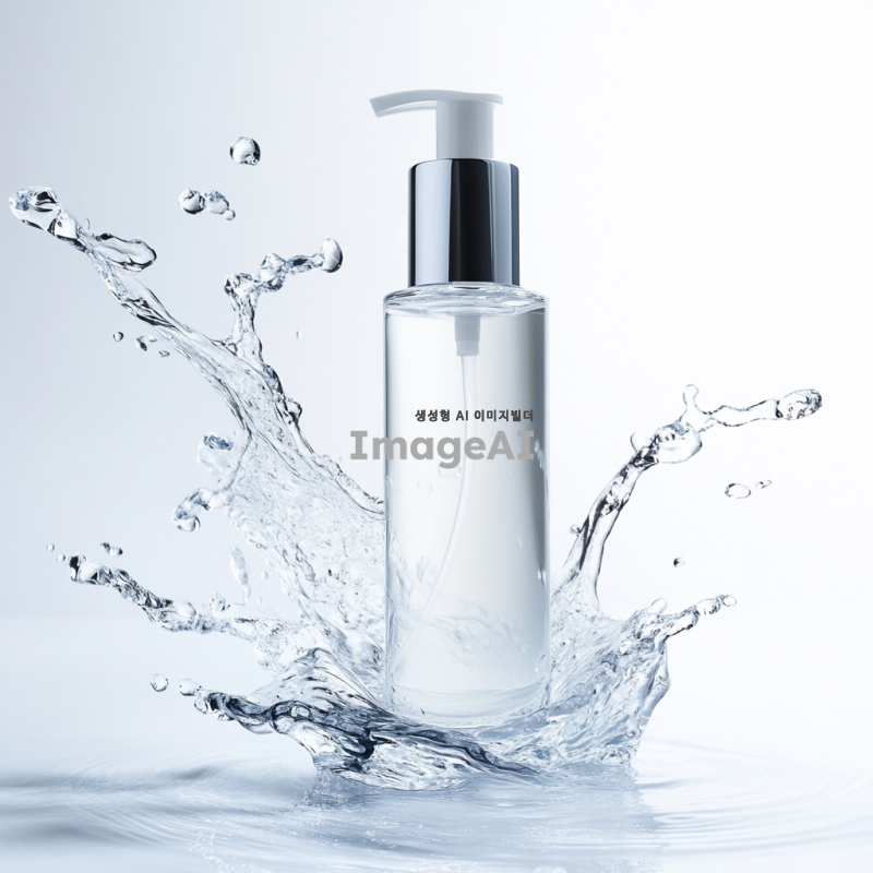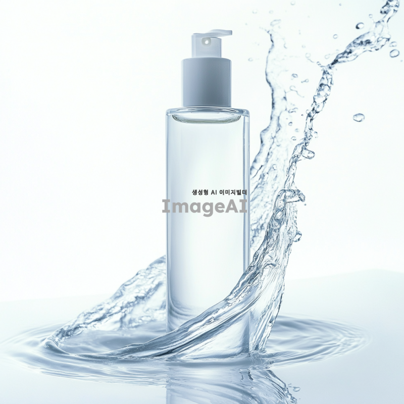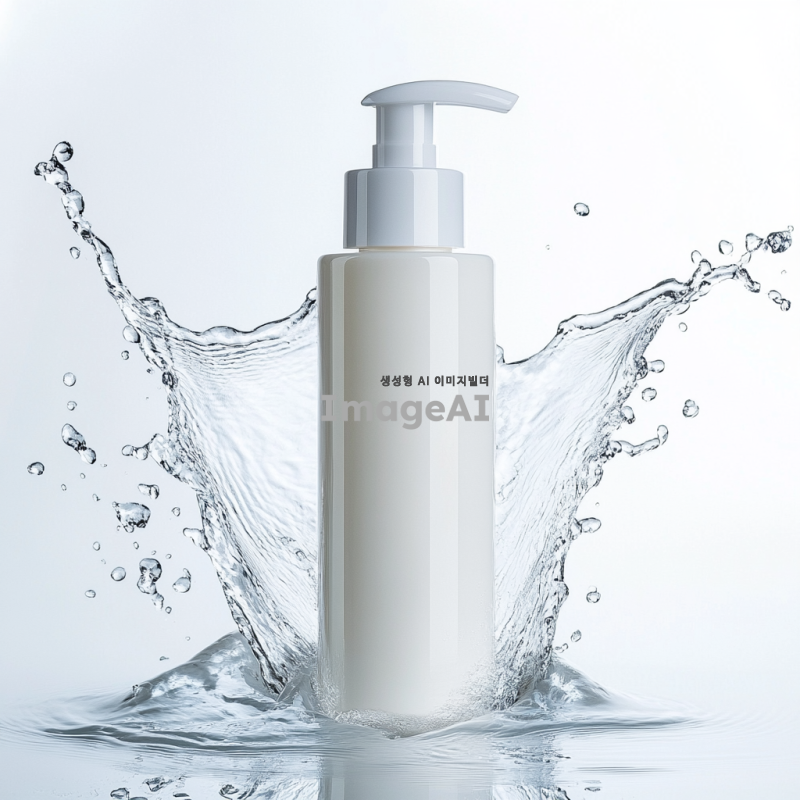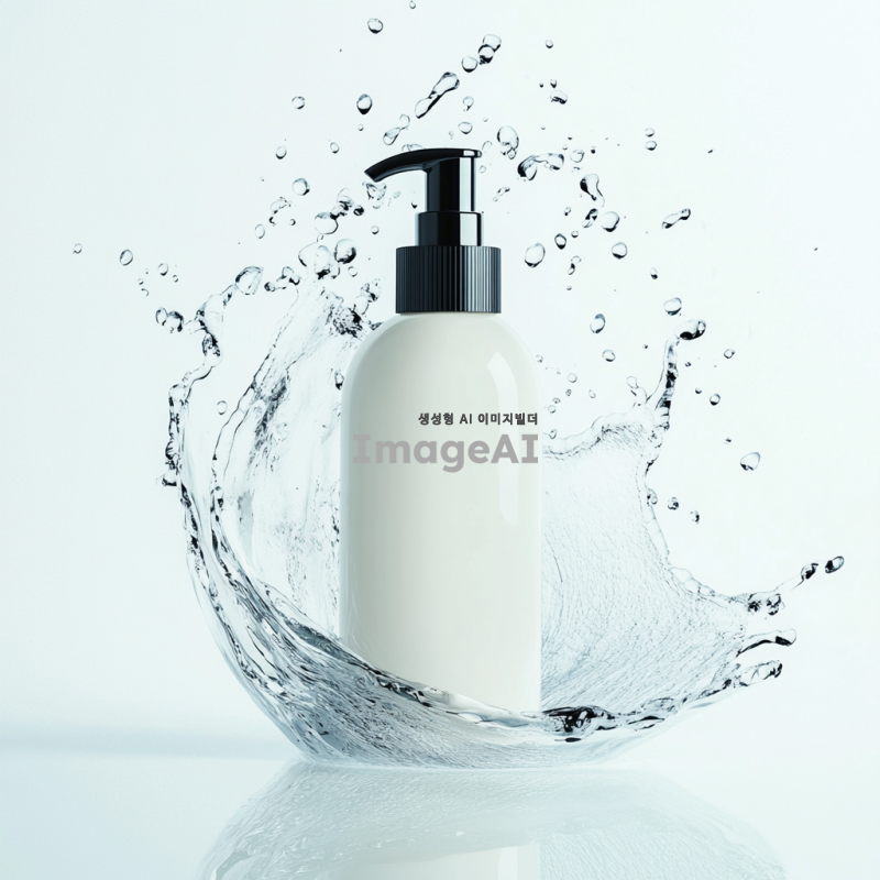 깨끗한 하얀 배경 위에 로션통을 세워 두고, 로션통 위에서 맑은 물줄기가 흘러내리는 장면. 물의 움직임이 생동감 있게 표현되며,