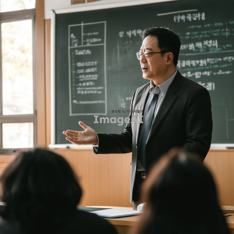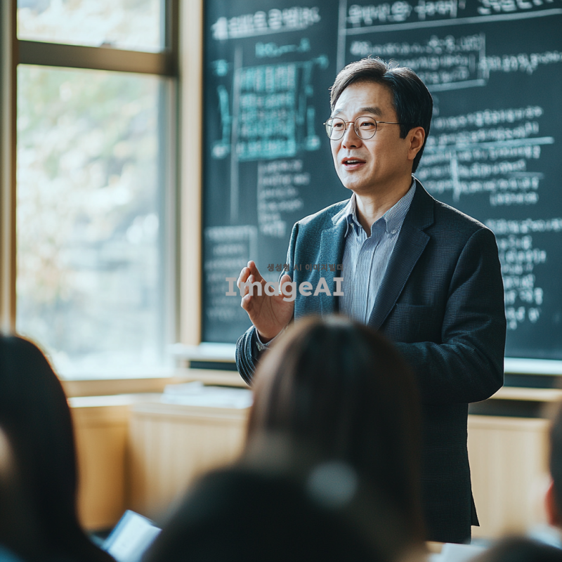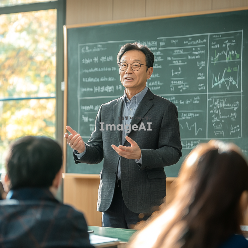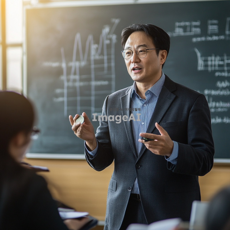 중년의 한국인 교수가 대학 강의실에서 코인 경제학에 대해 강의하는 장면, 깔끔한 정장 차림에 안경을 쓰고 있으며, 강의실의 칠판에는 복잡한 경제 그래프와 코인 관련 공식들이 적혀 있음. 교수는 열정적으로 설명하고 있고, 학생들이 집중하며 필기하는 모습. 강의실 창문으로는 밝은 햇살이 들어오고, 현대적인 대학 캠퍼스의 분위기가 느껴짐.