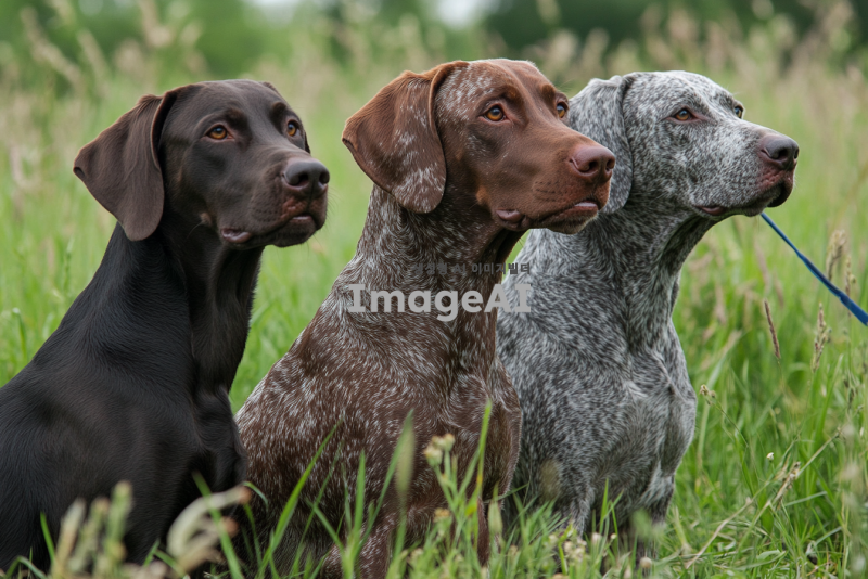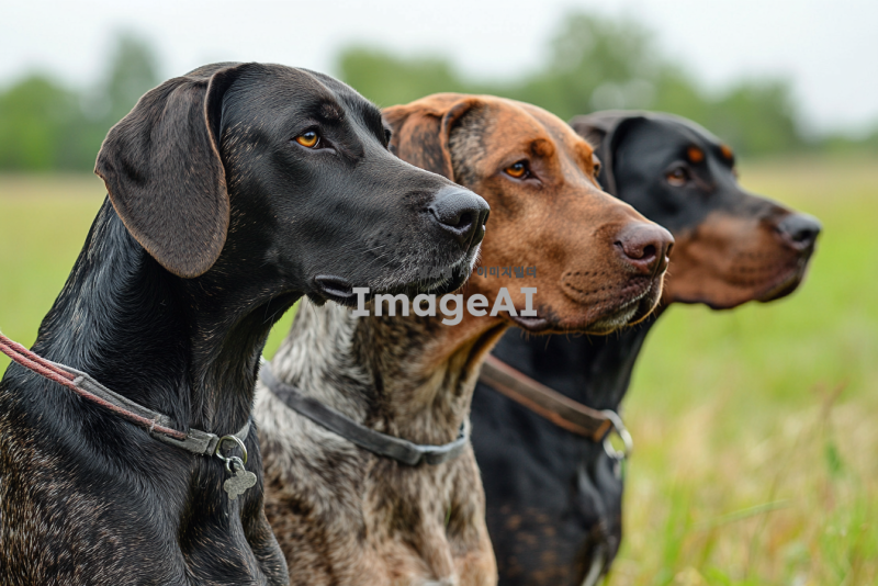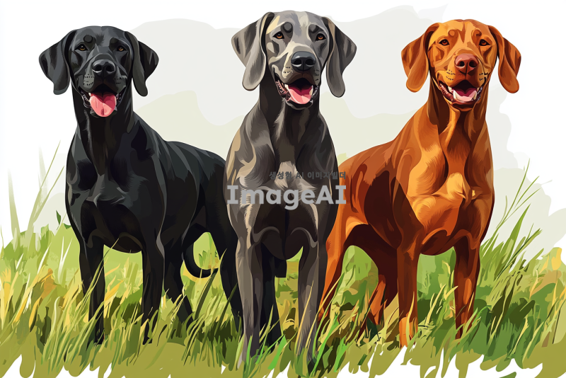 초원에 묶여있는 사냥개 세 마리가 있다. 사냥개들은 근육질의 몸매와 날렵한 털을 가지고 있으며, 각각의 사냥개는 다른 색상을 띠고 있다. 한 사냥개는 검은색, 다른 하나는 갈색, 마지막 사냥개는 회색이다. 이들은 강력하고 민첩해 보이며, 눈은 날카롭고 집중되어 있다. 사냥개들 앞에 먹이가 던져지자, 그들은 으르렁거리며 긴장감 있게 먹이를 향해 뛰쳐나가려는 자세를 취하고 있다. 주변은 푸른 초원과 맑은 하늘로 둘러싸여 있으며, 약간의 바람이 불어오는 듯한 느낌을 준다.