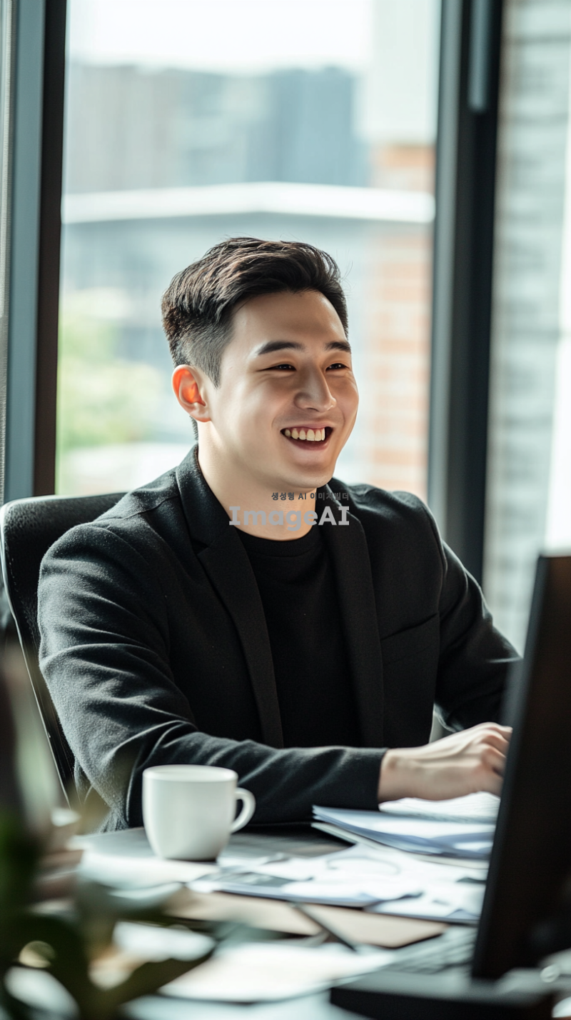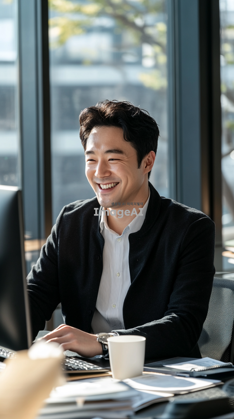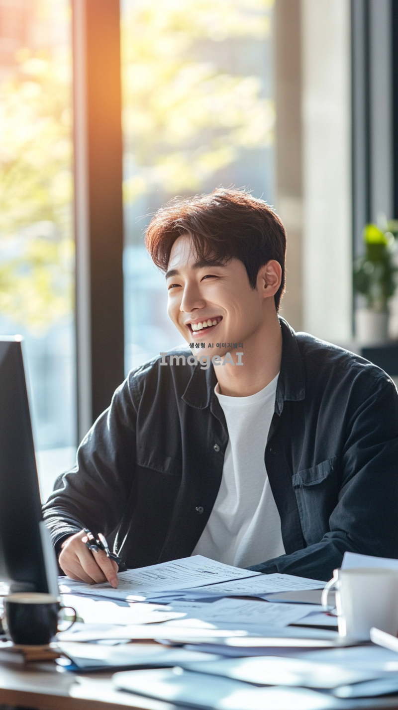 30대 한국인 남성이 사무실 책상에 앉아 근무복을 입고 컴퓨터 화면을 보고 웃고 있는 모습, 주변에는 서류와 커피잔이 놓여 있으며, 창문 밖으로는 밝은 햇살이 들어오는 장면, 현대적인 사무실 인테리어, 자연스러운 표정과 자세.