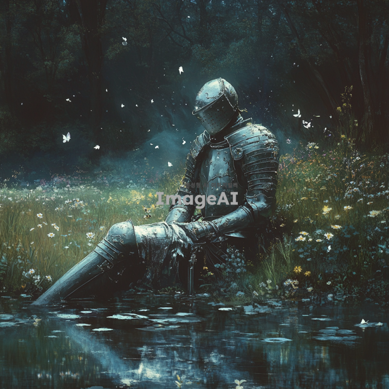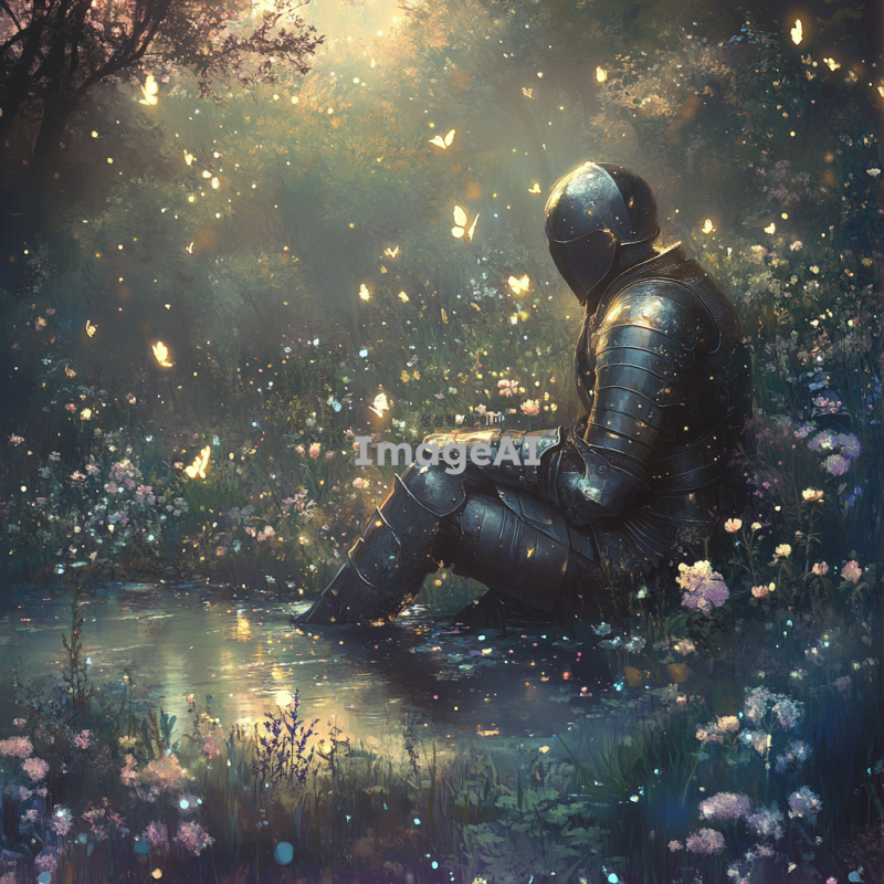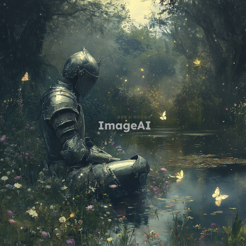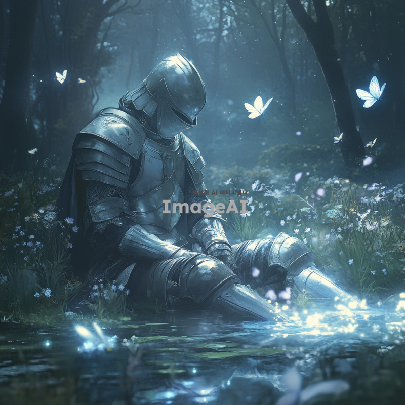 몽환적인 분위기의 숲 속에 앉아 있는 중세 시대의 한국인 기사, 은빛 갑옷을 입고 있으며, 부드러운 달빛이 갑옷에 반사되어 반짝임, 주변에는 신비로운 안개가 깔려 있고, 희미하게 보이는 빛나는 나비들이 날아다니는 장면, 기사 주변에는 고요한 연못과 아름다운 야생화들이 피어 있는 모습, 전체적으로 부드럽고 꿈결 같은 색조와 조명 사용.