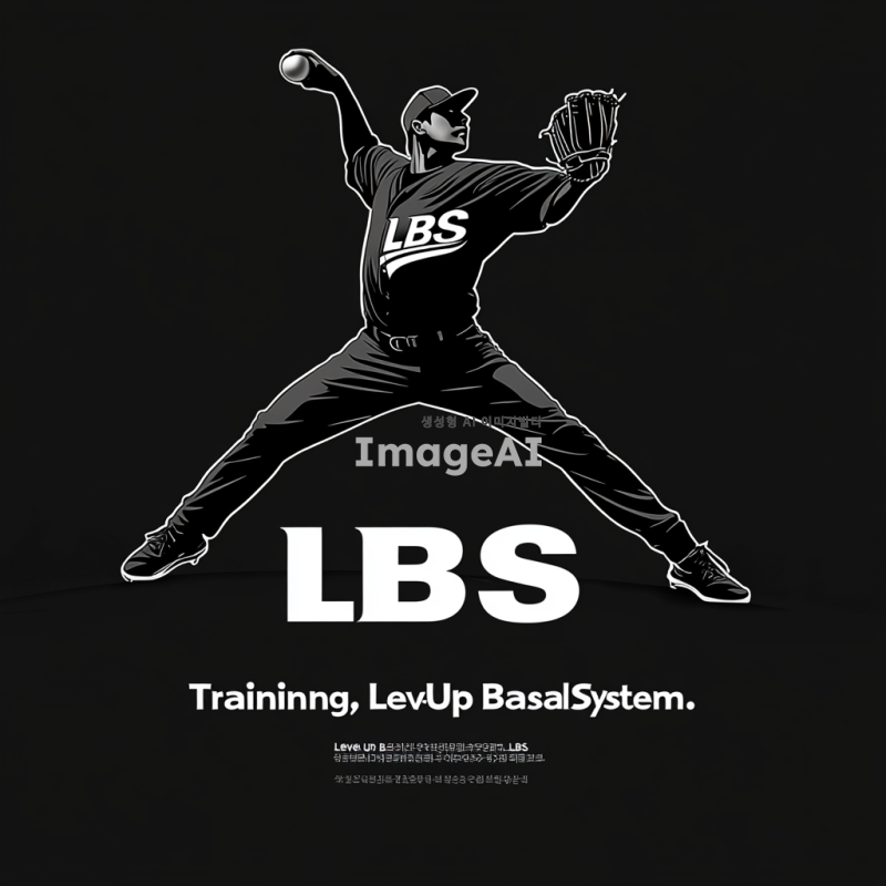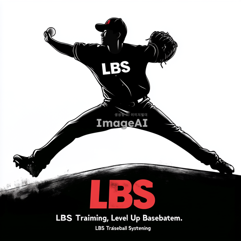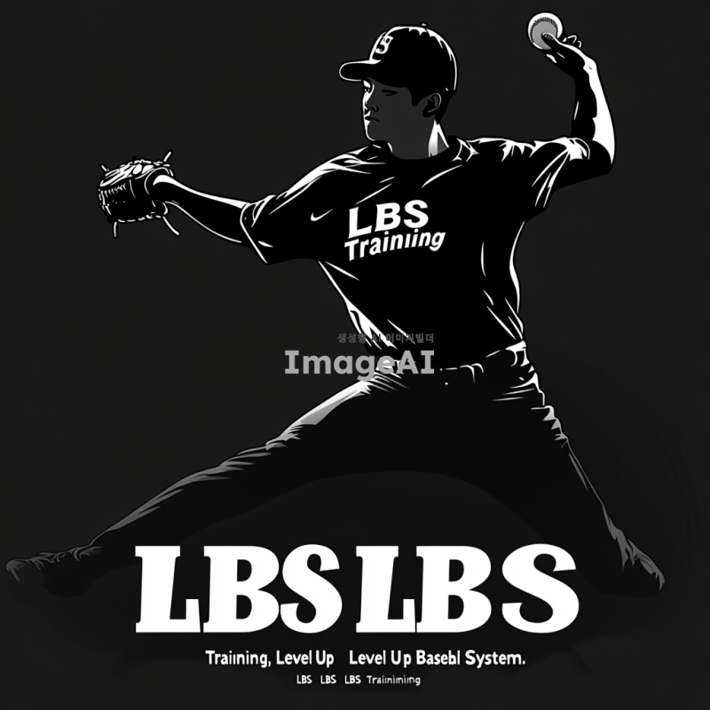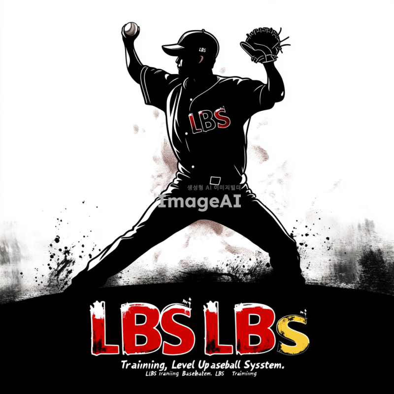 검정색 실루엣으로 역동적인 투구를 하는 한국인 투수, 투수 유니폼에 LBS라고 적혀있음. 실루엣 아래 큰 글자로 "LBS Training"이 적혀 있으며, 그 밑에 작은 글자로 "Level Up Baseball System"이라고 적혀져 있음. 실루엣과 글자는 분리되어 있고, "LBS Training"이라는 글자가 강조되어 강렬하지만 부담스럽지 않은 느낌.
