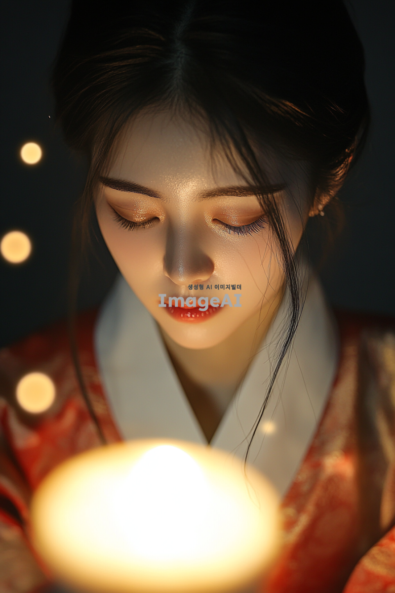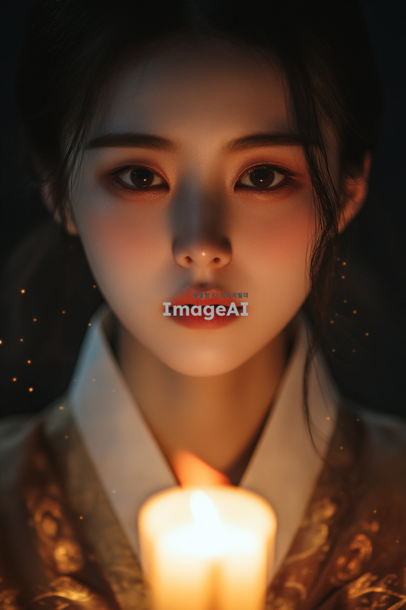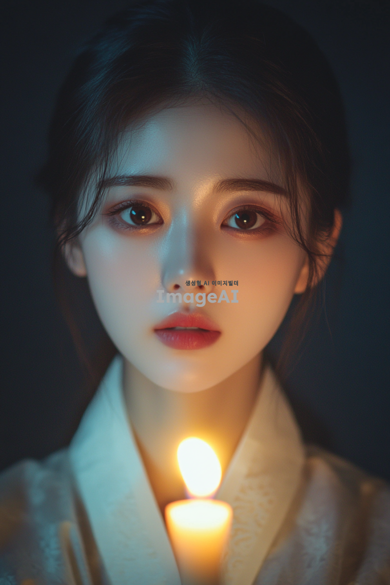 20대 젊고 매력적인 신비로운 여성, 별빛과 촛불의 잔잔하고 신비로운 이미지를 의인화한 모습, 한국 전통적 의상 착용, 은은한 빛이 감도는 달이 떠있는 어두운 밤하늘을 배경으로, 부드럽고 신비로운 분위기, 별빛처럼 반짝이는 눈, 촛불의 따뜻한 빛이 얼굴을 비추는 모습, 고요하고 평화로운 느낌, 전통적인 한국의 정취가 느껴지는 세부 묘사.