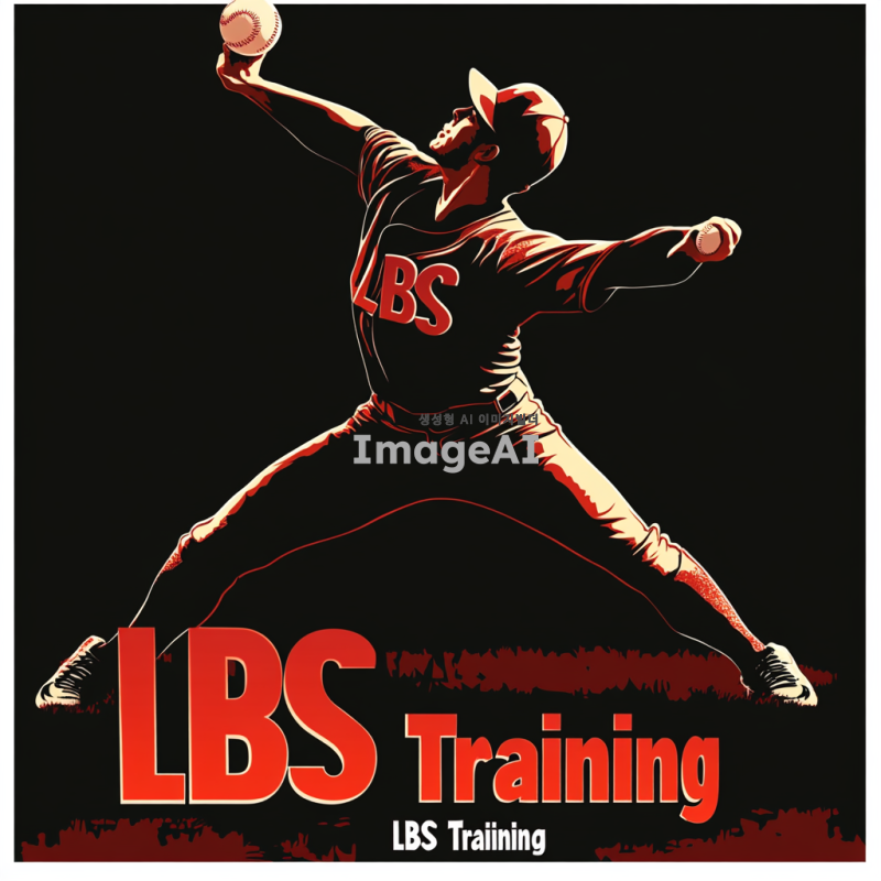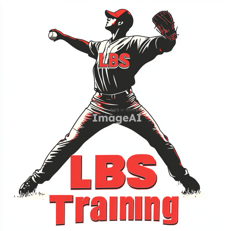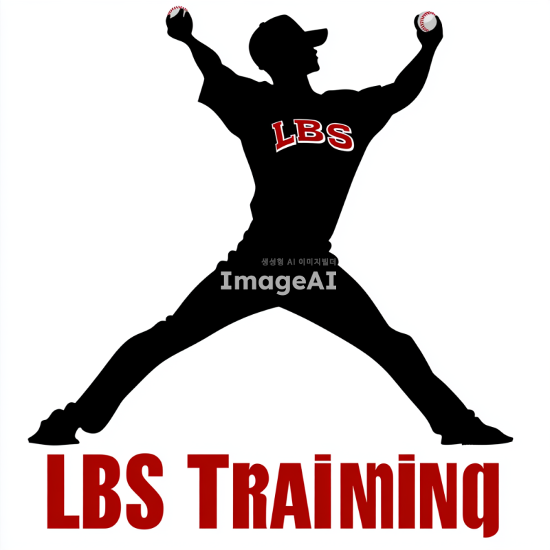 검정색 실루엣으로 자연스럽게 공을 던지는 투수의 모습, 투수의 유니폼에는 작게 "LBS"라고 적혀 있음. 이미지 하단에 한줄로 크게 "LBS Training"이라는 글자, "LBS"는 빨간색, "Training"은 하얀색으로 표현. 글자는 깔끔하고 직관적인 스타일.